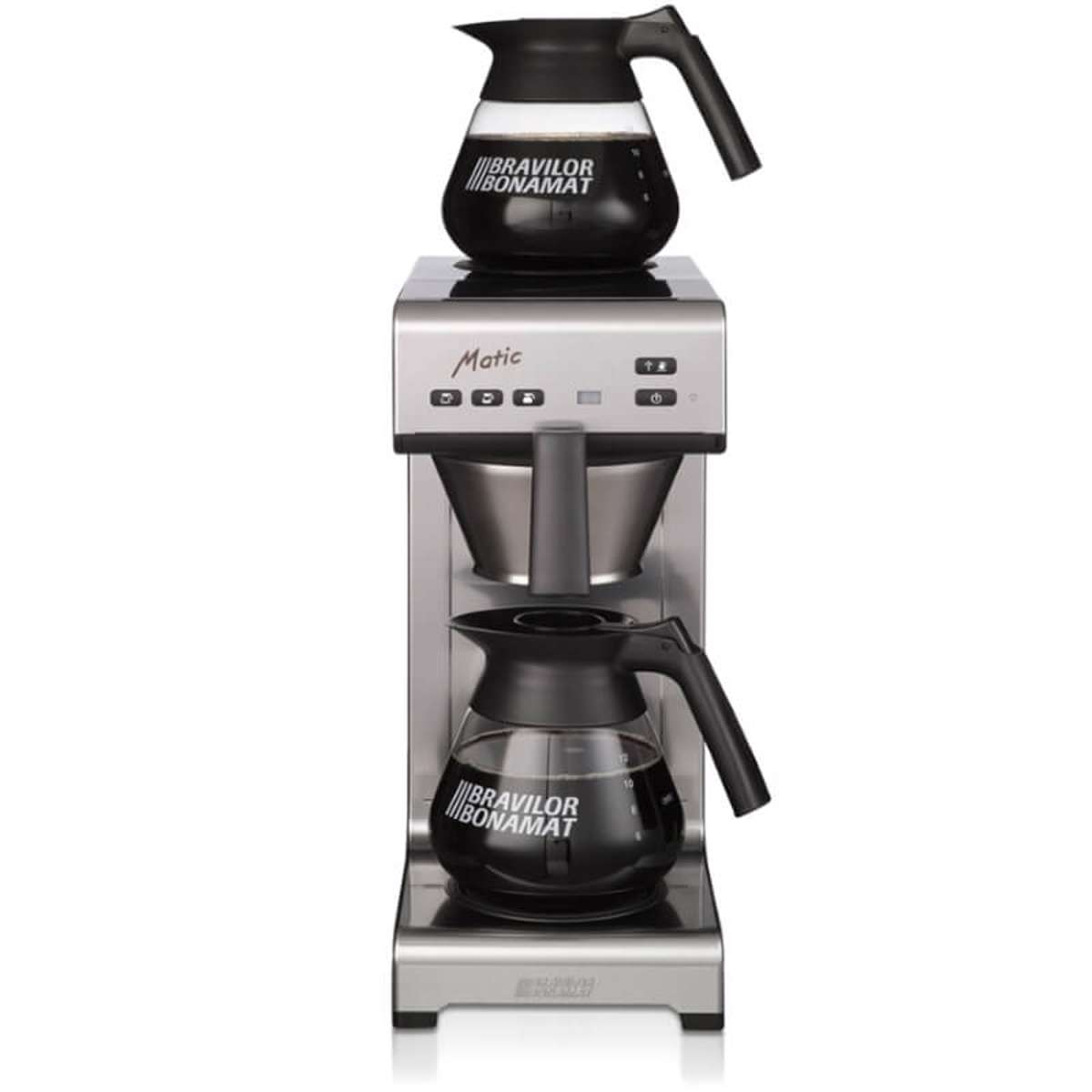 Bravilor Bonamat Matic 2 er en pålidelig og robust filterkaffemaskine. Bonamat Matic 2 kaffemaskine har fast vandtilslutning, så du ikke behøver at fylde maskinen. Det er en utrolig god filterkaffemaskine til professionel brug og brygger kaffe af høj kvalitet. Matic kaffemaskine er nem at betjene og er forsynet med 2 varmeplader med automatisk temperaturjustering, så du kan holde kaffen varm i kanderne. Grundet de selvregulerende varmeplader kan Bonamat Matic give dig den optimale temperatur afhængigt af mængden af kaffe i kanden. Bonamat Matic er velegnet til små og mellemstore virksomheder, konferenceområder, tekøkkener og små cafeer.