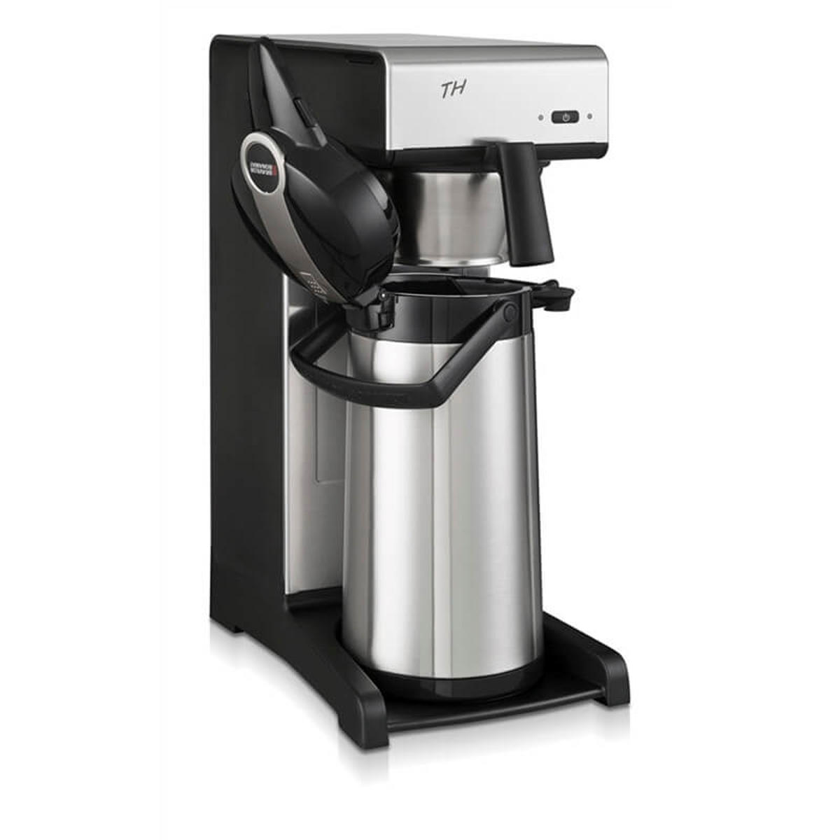 Bravilor Bonamat TH 10 er en kaffemaskine med termokande til formalet kaffe, der brygger den friske kaffe direkte i den store termokande, som kan indeholde helt op til 2,2 L kaffe. Bonomat kaffemaskine TH10 er en kompakt model med et enestående gennemløbssystem, der varmer vandet op til den korrekte temperatur (92-96 grader), så du er sikker på at brygge den perfekte kaffe med den bedste smag hver gang. Alle kan betjene TH 10. Du fylder vandbeholderen, og efter syv minutter har du frisk kaffe svarende til omkring 17 kopper. Både maskine og kande er i flot stål design. Filterkaffemaskine TH10 er super nem at bruge, og den holder på kaffens smag og temperatur i op til 4 timer. Ideelt til travle miljøer.