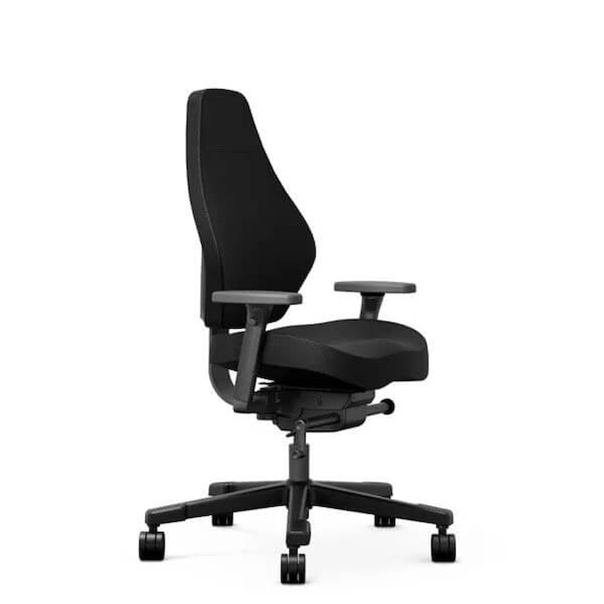3D-armlænene kan justeres i bredden fra 410 til 490 mm og giver plads til brugere med forskellige kropsformer. Stolen er polstret med det slidstærke tekstil Mozart fra danske Gabriel – med hele 200.000 Martindale og høj lysægthed. Det sorte nylonstel med hjul giver en solid base og nem mobilitet.