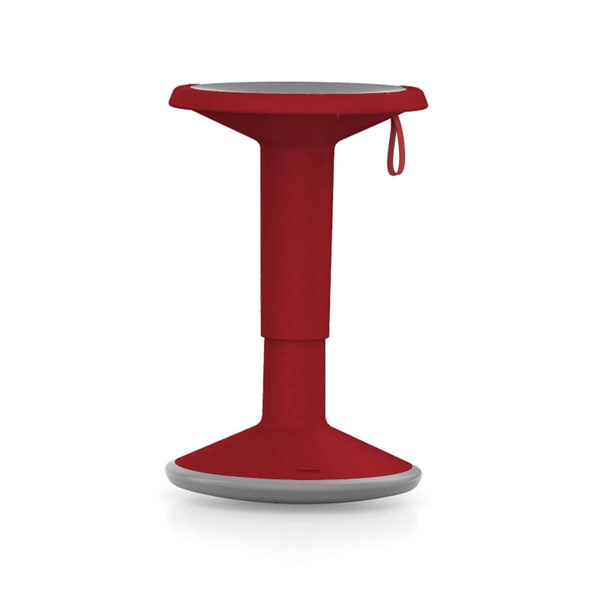 Den iøjefaldende røde strop spiller en dobbelt rolle som justerings-håndtag og design-kendetegn, der fremhæver Up-is-1-taburettens afslappede funktionalitet.
