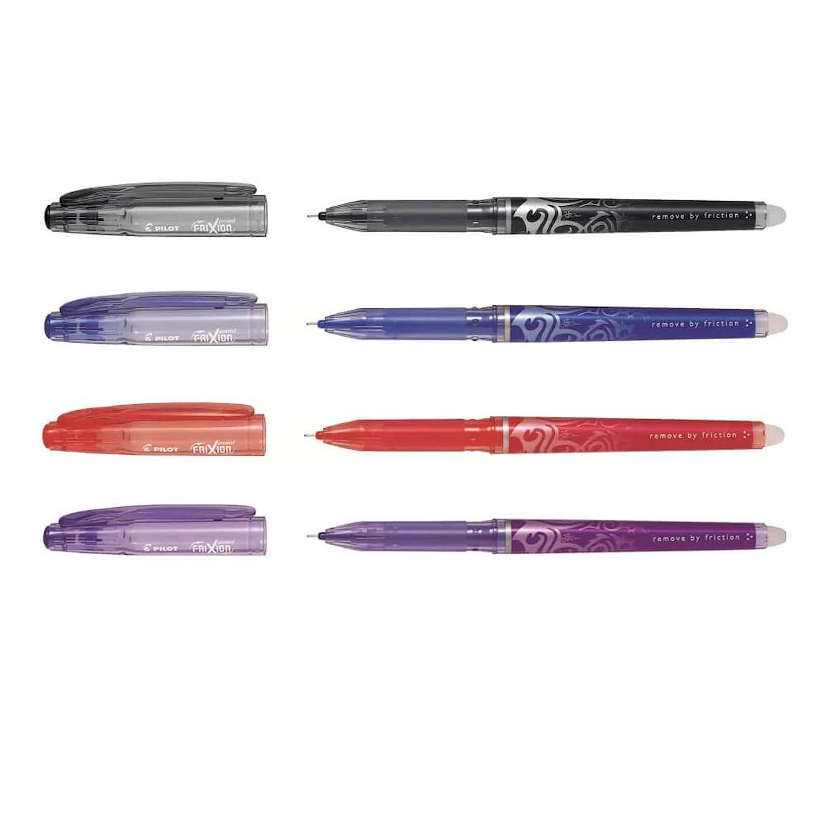 Frixion fra Pilot er en serie af penne, der giver dig mulighed for at slette uden at ødelægge eller sværte papiret. En helt ny varmesensitiv blæk gør, at det kan fjernes ved at friktionen fra viskelæderet varmer blækket op, og det kan fjernes uden spor på papiret. Pennen glider let hen over papiret med en klar og tydelig streg, der skriver præcist med Hi-tecpoint spids. Den revolutionerende pen har et passende ungt look med tatoo-mønster. Egner sig ikke til underskrifter, juridiske dokumenter, eksamenspapirer og andre dokumenter, der kræver permanent blæk.