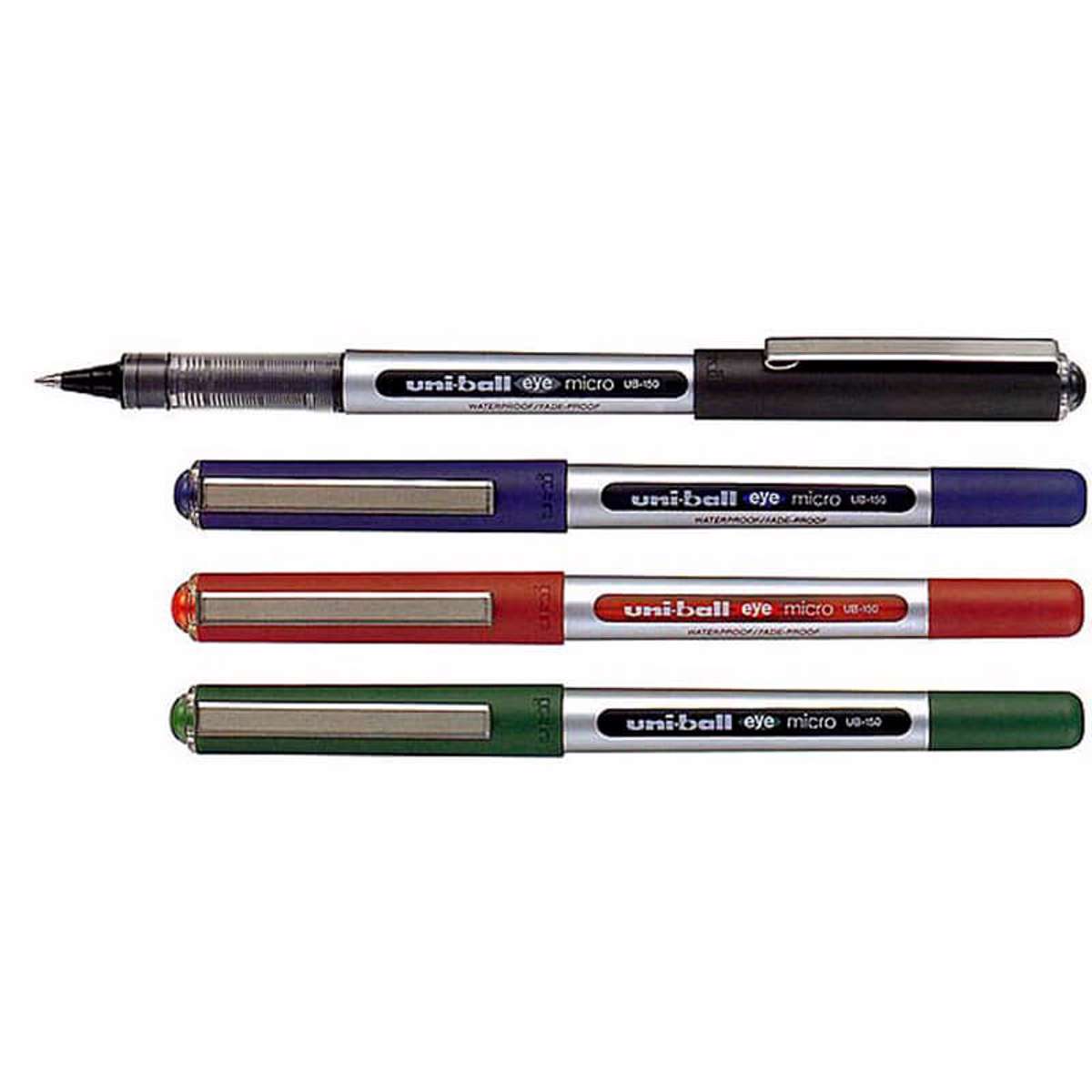 Uniball 150E Eco - Eye Micro - Den klassiske og populære rollerpen med et specielt blækledersystem, "Uni-flow", der sikrer en jævn blæktilførsel lige til sidste dråbe. Rollerpennen skriver med vandbaseret pigmentblæk, der er vandfast, lysægte og godkendt dokumentægte blæk. Dvs at skriften ikke falmer, selvom den udsættes for lys. Uniball UB-150 er derfor en sikker dokumentpen til underskrifter og arkivering og et godt alternativ til mr-205. En rustfri stålspids sikrer behagelig blød skrivning og en skrivekugle af tungstenkarbid (Wolframcarbid) gør at pennen ikke klatter. Kort sagt, er det en pen, du kan stole på! Skaftet er af PP-plast med et synlig felt, der viser blækbeholdningen. Hætten har metalclip og hættens farve viser blækfarven. Fås i blå, rød, grøn og sort med en 0,2 mm spids, der skriver en fin streg.