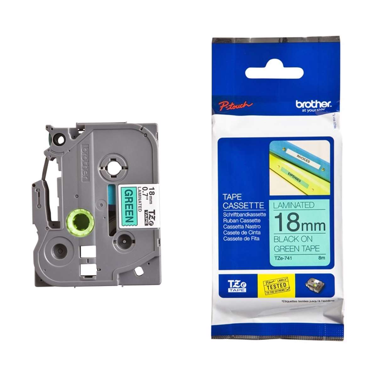 Labeltape Brother TZe 741 - prægetape fra Brother, der tåler næsten hvad som helst; fugt, kulde (ned til -50°C ), varme, stærke opløsningsmidler som syre samt mange andre kemikalier, olie, sollys og ikke mindst kraftig slid. Passer til P-touch TZe-tape labelmaskiner. TZe741