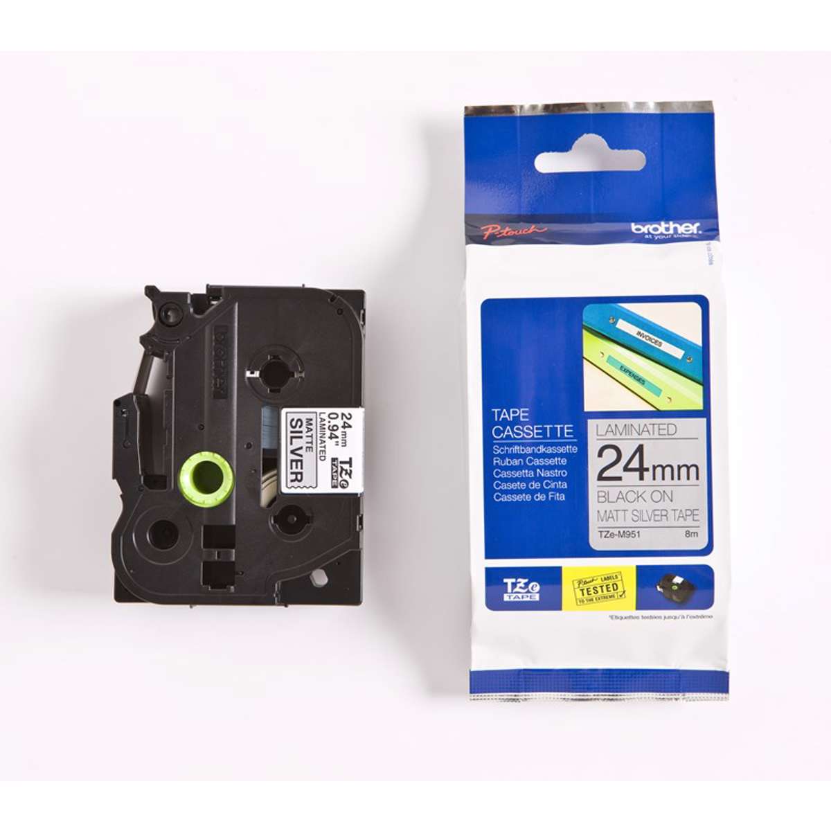 Labeltape Brother TZe M951 - professionelle laminerede labels fra Brother, der tåler næsten hvad som helst; fugt, kulde (ned til -50°C ), varme, stærke opløsningsmidler som syre samt mange andre kemikalier, olie, sollys og ikke mindst kraftig slid. Passer til P-touch TZe-tape labelmaskiner.
