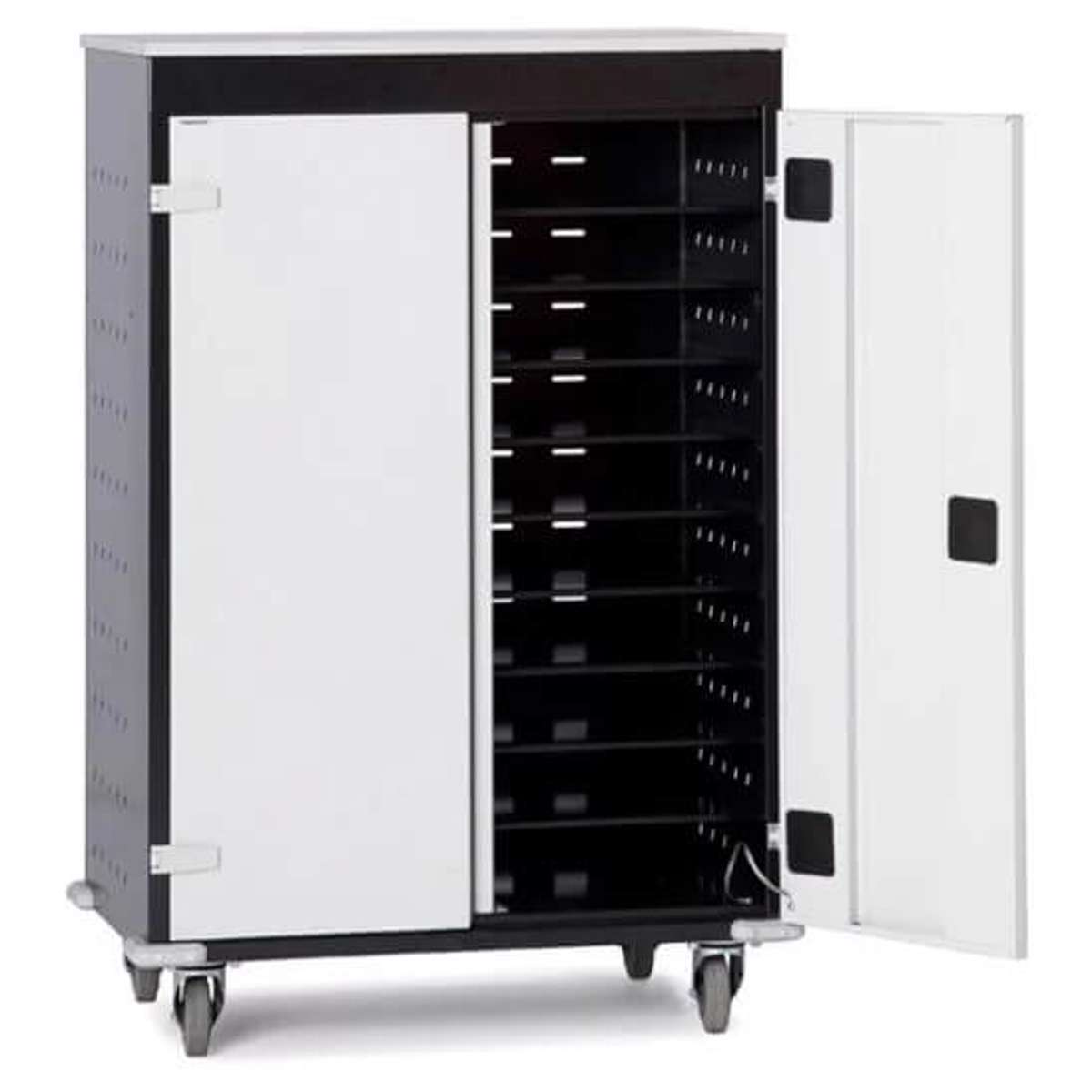 Praktiske mobile computer-skabe med 20 rum - h x b x d = 1250 x 920 x 500mm, for opbevaring og ladning af laptops og mobiltelefoner. Computer-skabet har en solid konstruktion med to låsbare døre, solid cylinderlås, store letrullende låsbare hjul og praktisk håndtag for let håndtering af vognen. Hvert rum har eget strømudtag (shukostik til opladning). Tilkobling til el-net via en fælles tilkobling med egen 16A sikring og overspændingsværn. Modellen har sekventiel strømstyring til hvert rum, således at ikke alle ladestationer starter samtidigt. Dette er for at varetage el-sikkerheden. Leveres standard i miljørigtig pulverlakering, sort kabinet RAL 7021 og lys grå døre RAL 7035 samt en lysegrå topplade.
