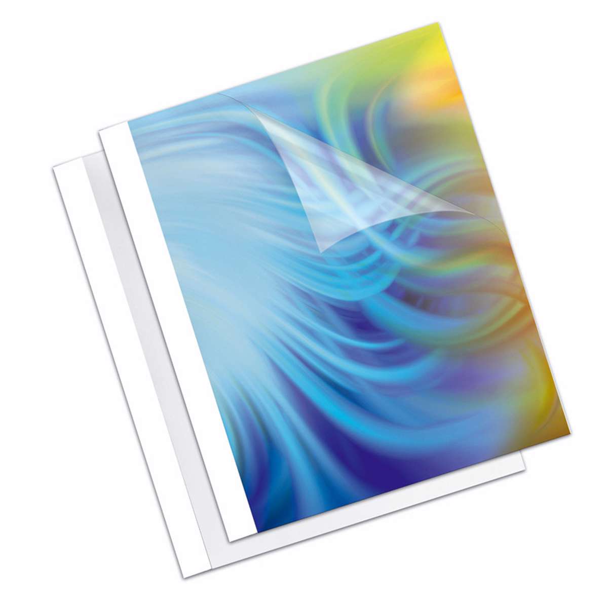 Fellowes limindbindingsomslag til for- og bagside. Transparant forside i PVC og bagside af 200g blankt karton. Egnet til indbinding af dokumenter på 201-251 sider. Kompatibel med Fellowes termiske Helios indbindingsmaskiner.