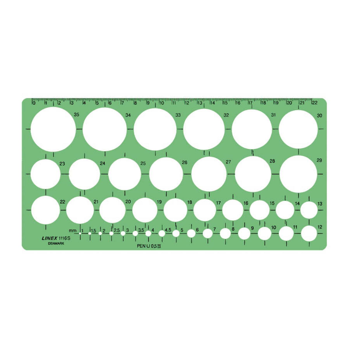 Skabelon med cirkler. Med tuschknopper. Til pen 0,5 mm. Indeholder 39 cirkler med diameter fra 1 til 35 mm inklusive 1,5 – 2,5 – 3,5 – 4,5 mm. Med millimeterinddeling. Materiale: 1,2 mm grøntransparent SBS.