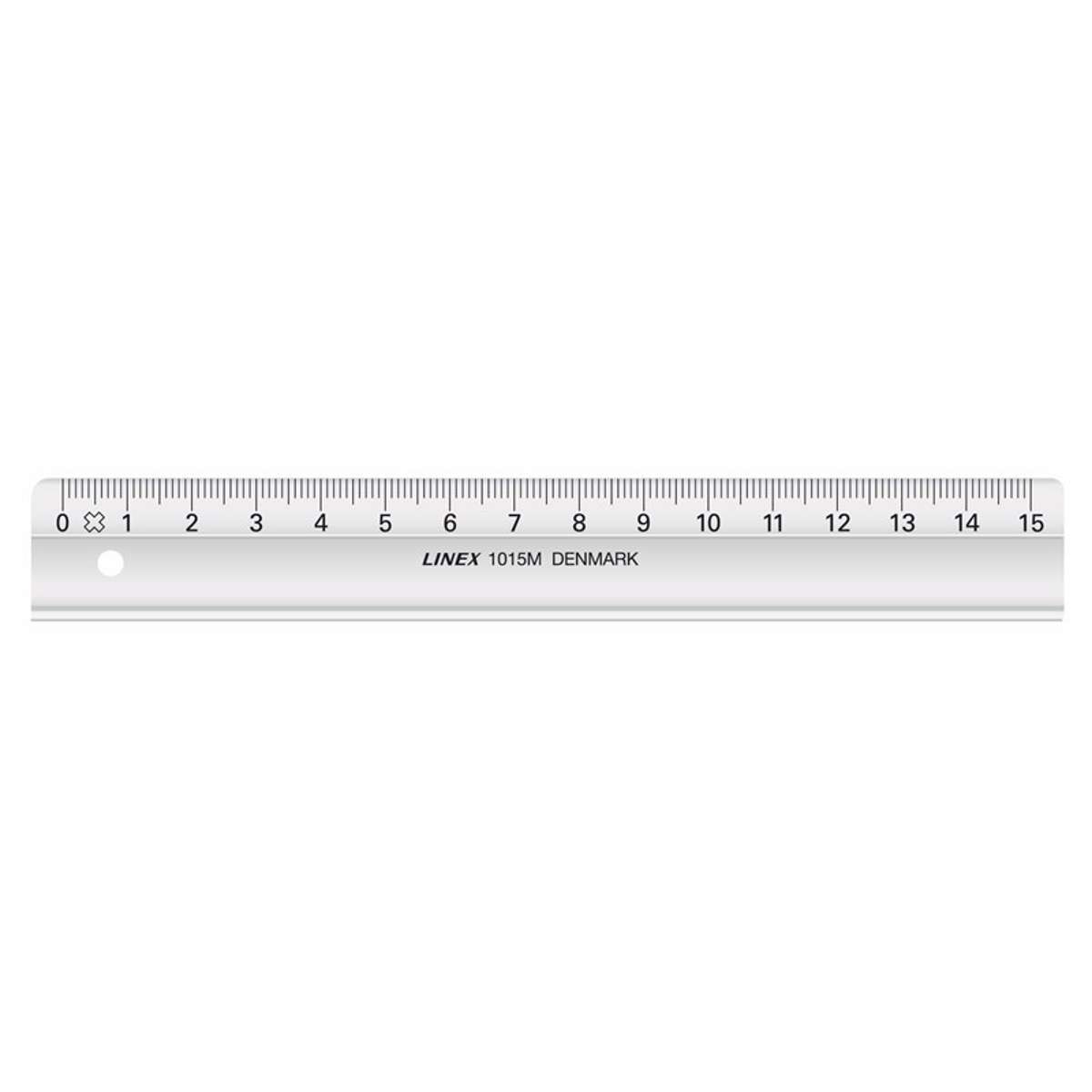 Lang 15 cm Linex skolelineal i klar hård plast og flot finish med facet og præcisionsinddelt tuschkant i mm og påtrykte cm-tal.