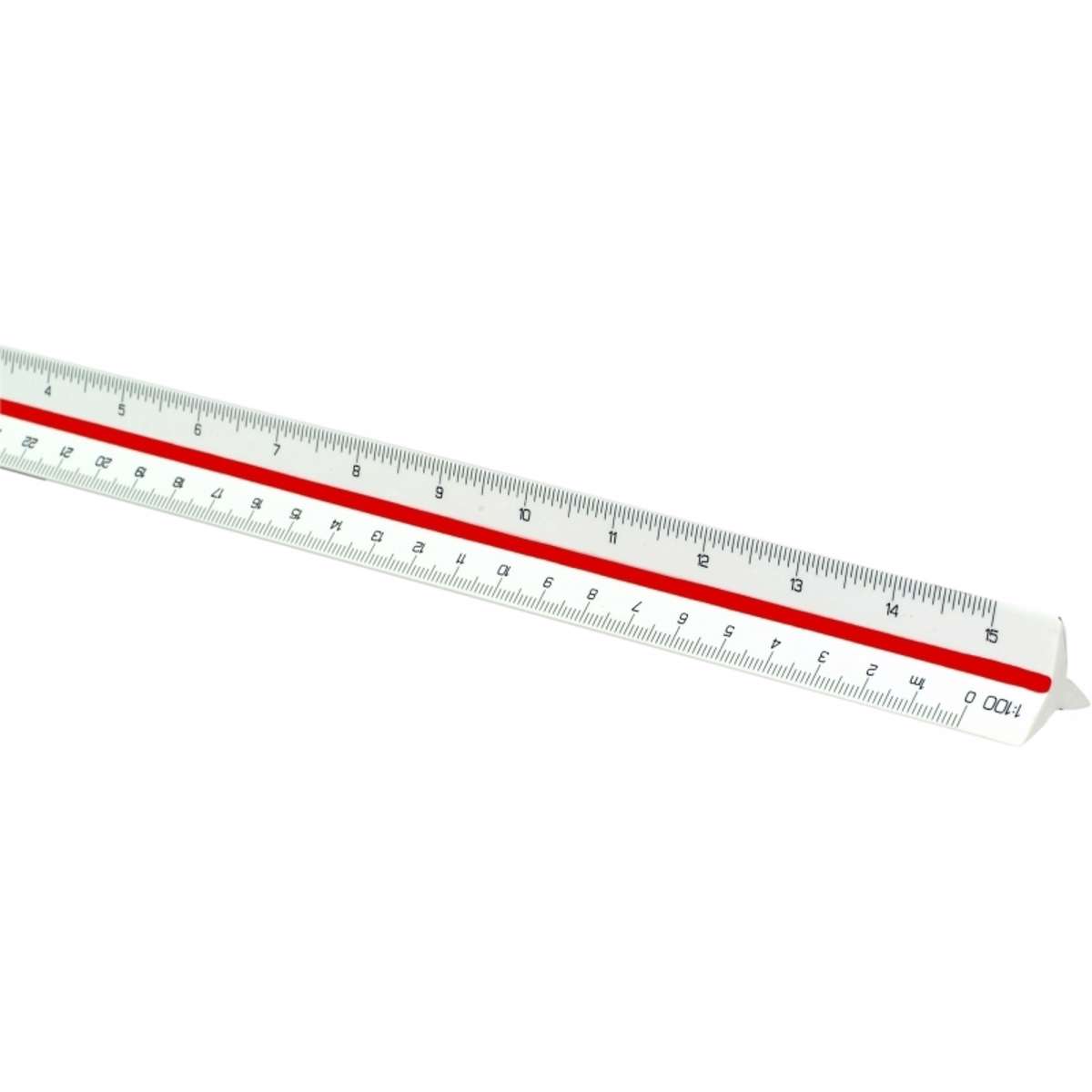 Trekantede målestokke fremstillet af mat hvid Dunirit. Længde 30 cm. Med 6 forskellige skalaer. Leveres i plastetui. Inddeling: 1:2,5, 1:5, 1:10, 1:20, 1:50, 1:100.