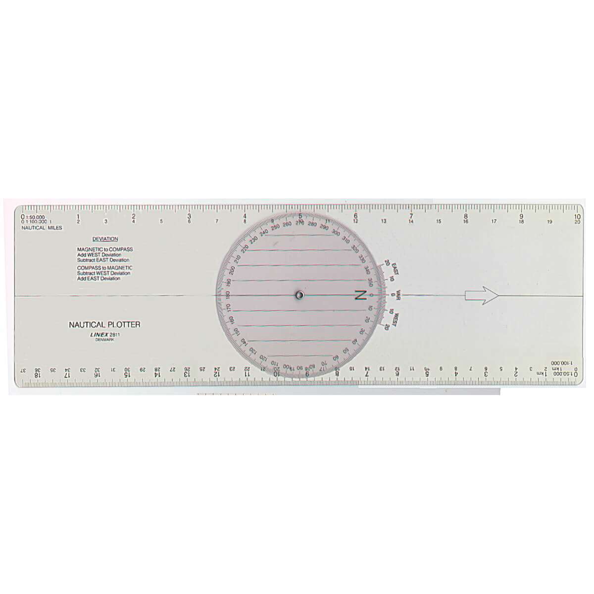 Søkort-plotter af linealtype med drejelig gradskive og misvisningsskala. Målnet på gradsiden orienteres på gradlinierne. Sømil- og km-skala langs kant. Mat overside kan beskriftes med blyant.380 x 120 mm.
