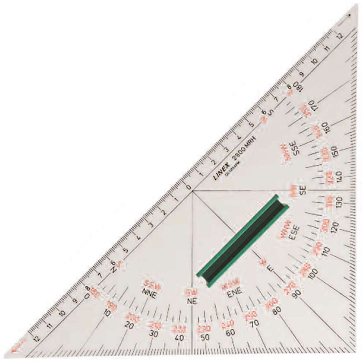 Med lodret kant og praktisk håndtag. Inddelt i grader og streger. Til afsætning af kurs og distance. Tofarvet tryk gør aflæsning lettere. Hypotenusen er inddelt i mm. Materiale: glasklar akryl.