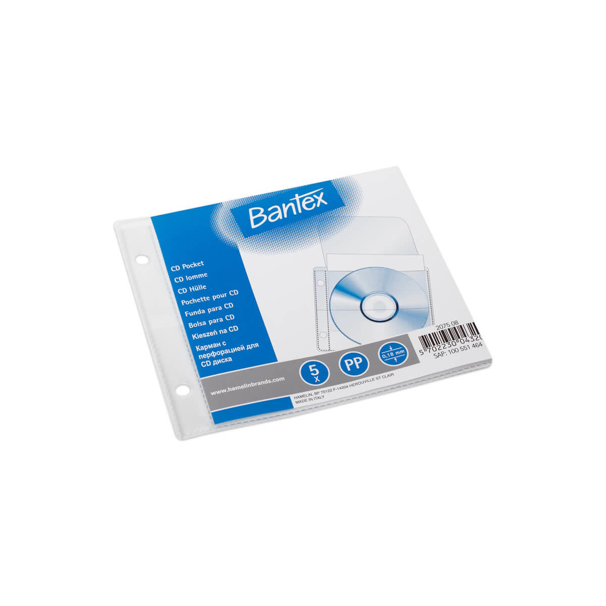 Plastlomme designet til at opbevare CD'er eller DVD'er med lukkeflap og huller til at sætte i f.eks. ringbind. Der er plads til både CD og tryksag i selve lommen, som måler 13 cm x 15 cm. 1 pakke indeholder 5 lommer.