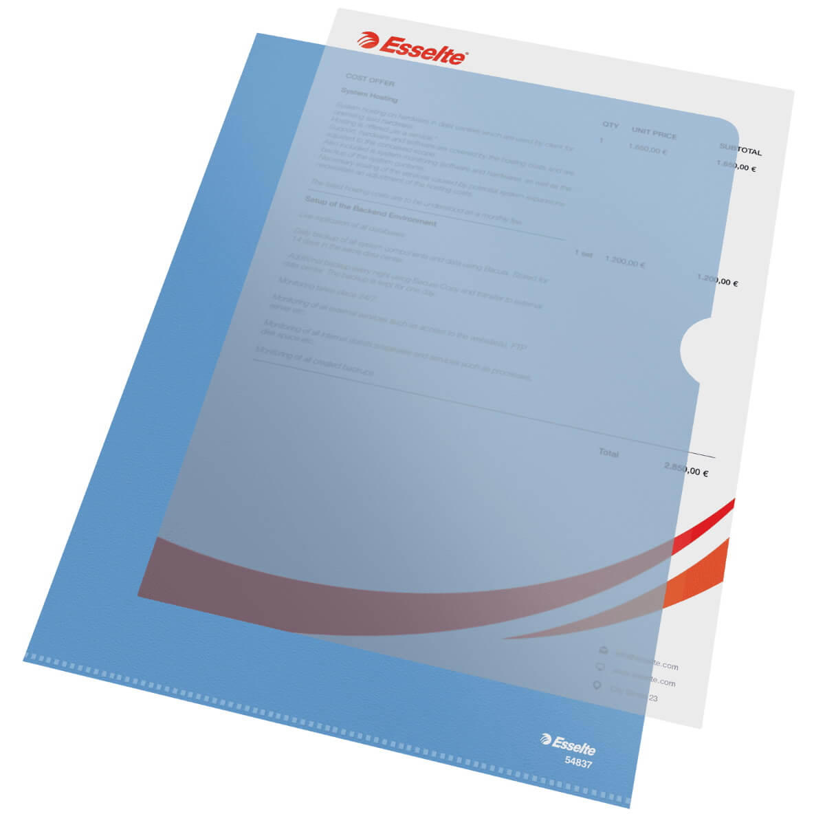Kraftigt og stærkt plastomslag fra Esselte i A4 format med blå, præget overflade og dermed skridsikker, så de ikke glider, når de ligger stablet. Chartequet har åbning i top og højre side, og er forsynet med fingerhak, så de er nemmere at åbne. Plastomslaget er fremstillet i kopisikker og recirkulerbar PP-folie med en tykkelse på 0,115 mm. Kopisikker/Copysafe betyder at lommerne er fremstillet af et holdbart polypropylene plastik, der sørger for at beskytte dine papirer og dokumenter, men uden at papiret med tiden klistrer fast til lommen, og teksten derved smitter af på lommen, og forsvinder fra papiret.