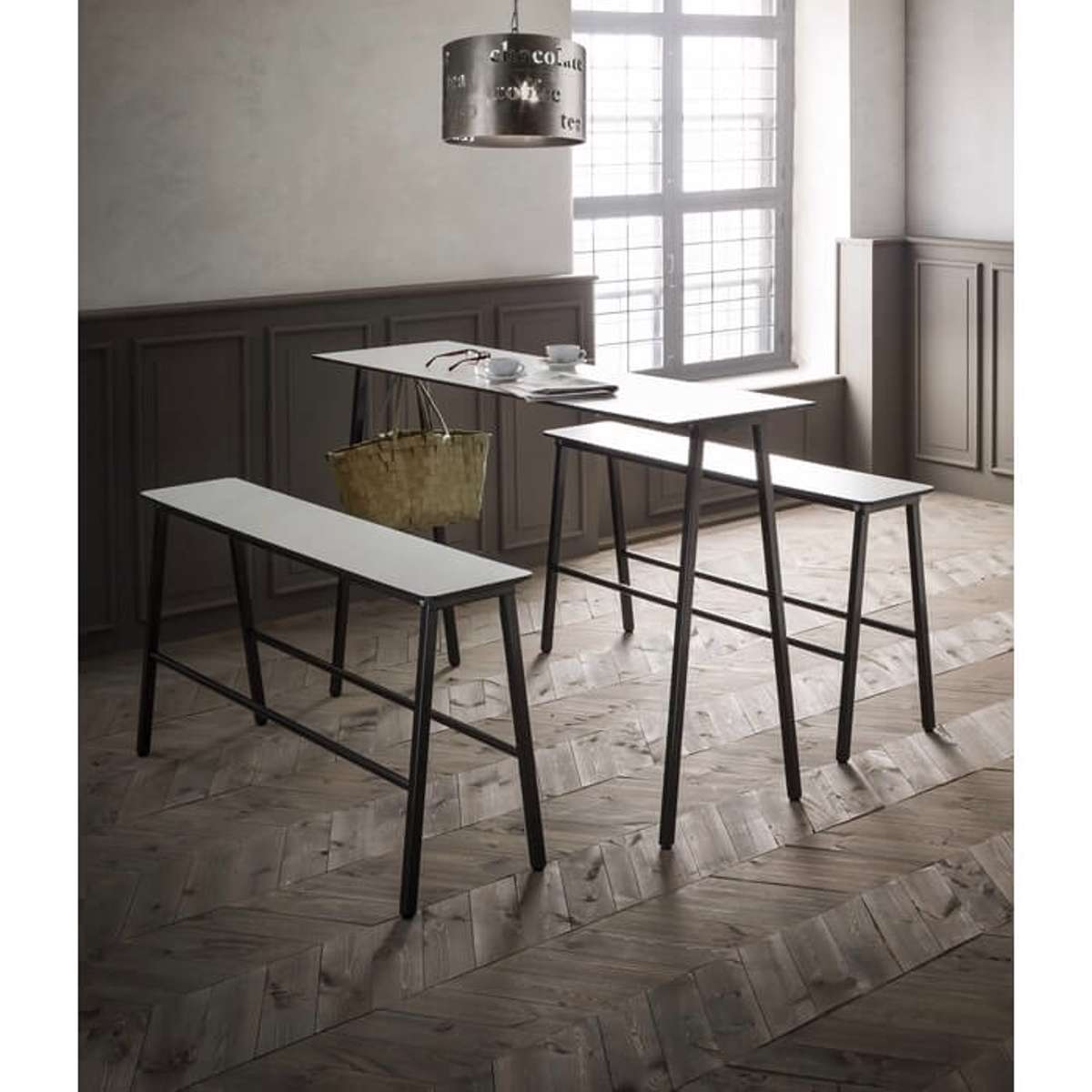Den høje slanke bænk med grå kompaktlaminat plade og antracit metal-stel er et elegant møbel, der sammen med Format højbordet giver et unikt look til både udendørs og indendørs miljøer. Metal-stellet er injiceret med technopolymer og pladen er kompaktlamineret træ. Det er en moderne funktionel bænk, der er perfekt til udendørs miljøer som cafér og restauranter. Under benene kan der justeres i højden. Der er indbygget fodstøtte i stellet.
