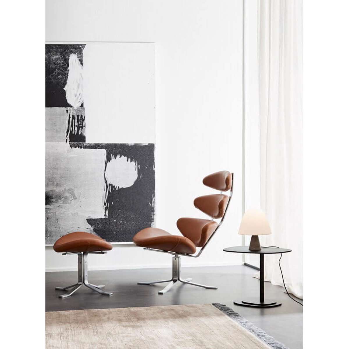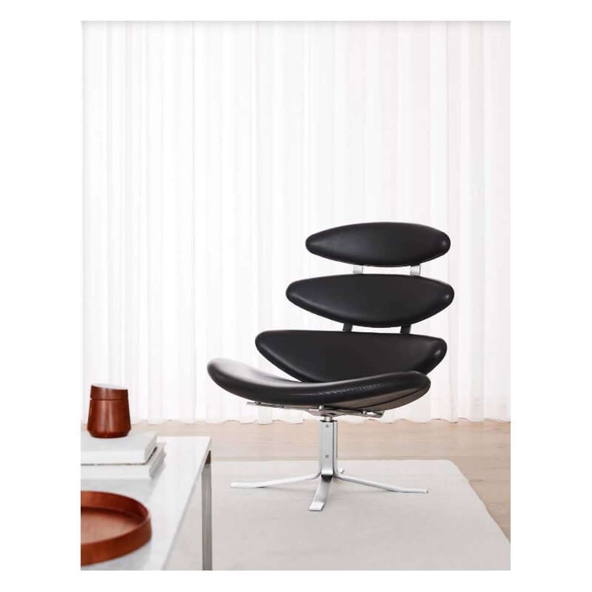 Corona-stolen er et særpræget design eftertragtet for dens unikke komposition. Fire elliptiske sædepuder udgør ryggen og sædet. Fuldt polstret og aftagende i størrelse er puderne påført til en støttende "rygrad af stål i mat krom.