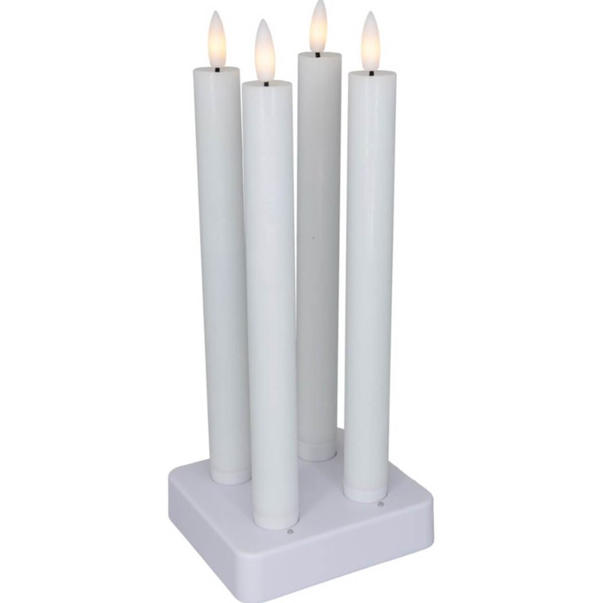 Med Lysestage LED-lys genopladelig i hvid plast 22,5 cm, 4 stk, får du et elegant og miljøbevidst alternativ til levende lys.
