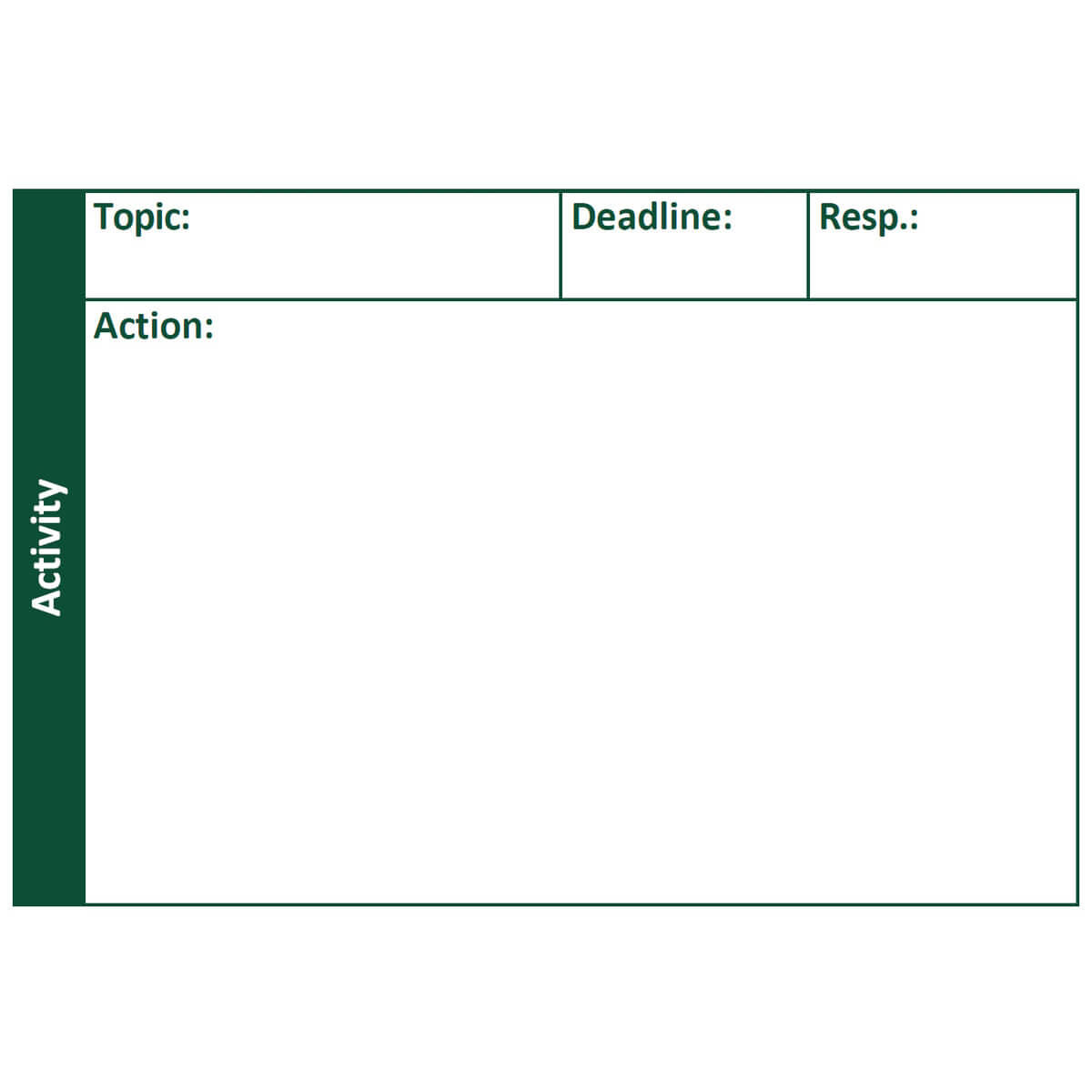 Smarte magnetiske labels til at sætte på whiteboardtavler som del af lean management, en Lean-opgave eller lean-løsning. Med fortrykte felter: Topic, Deadline, Resp. og Action - gør det nemt at føre LEAN løsninger. Leanstyring ved hjælp af magnetiske aktionskort med whiteboardoverflade og kraftig magnet. Mange muligheder for brug bl.a. i mødelokalet, det kreative arbejdsrum, skoleklassen og det krævende produktionsmiljø. Leantavler kaldes også Kaizentavler.