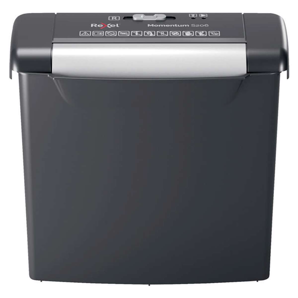 Kraften til at makulere mere! Rexel Momentum S206 makuleringsmaskine makulerer op til 6 ark på en gang med 2 minutters konstant makuleringstid. Ideel til hjemmebrug. P2, strimmelmakulering - strip cut - i 6 mm stykker. 9 liter beholder med 75 A4 ark kapacitet.