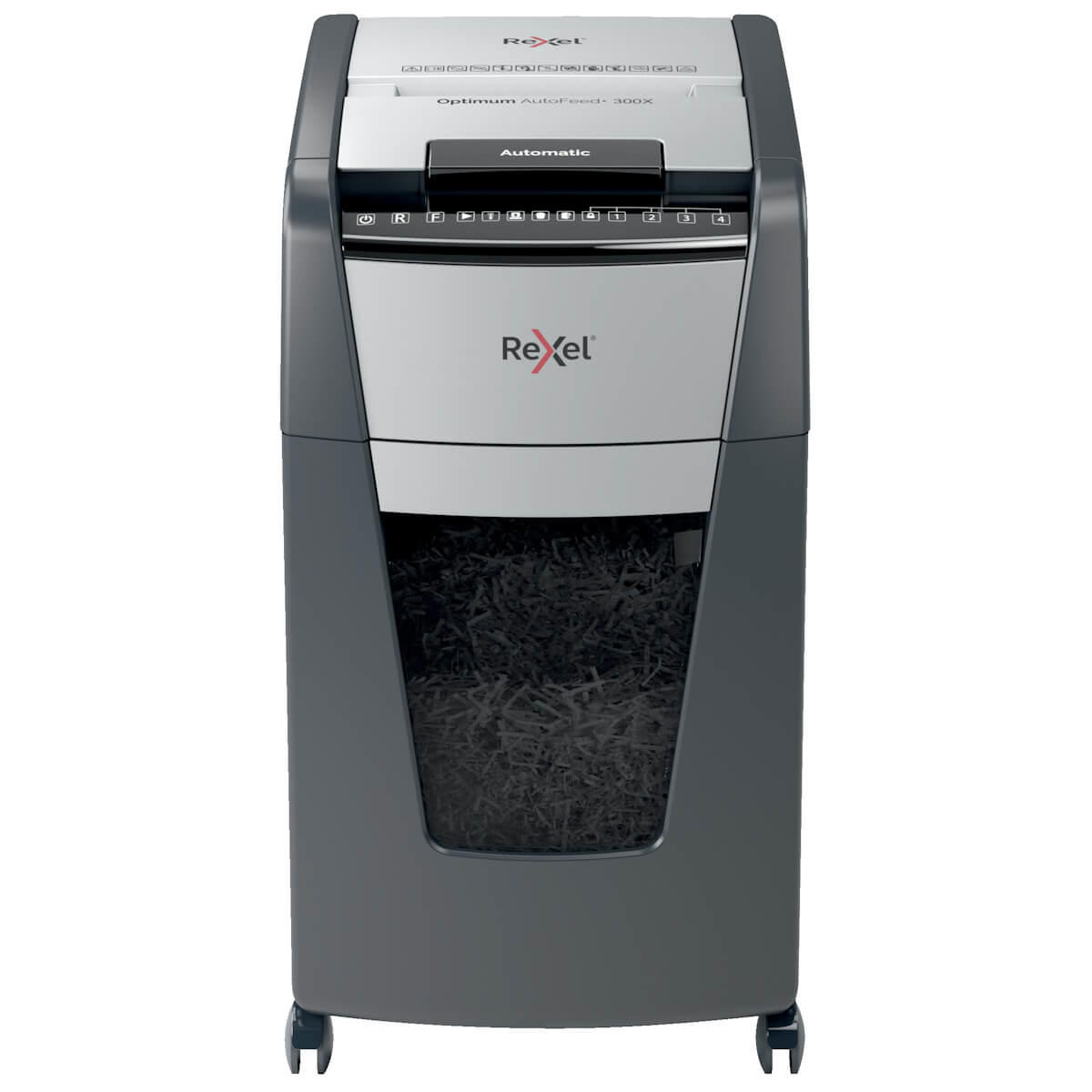 Optimum AutoFeed+ 300X makulator makulerer automatisk op til 300x A4 ark papir (80 g) i en omgang i P-4 (4x25 mm) krydsmakuleringsstykker. Denne auto feed maskine er en sofistikeret makulator til kontorbrug med en 60L beholder, der kan trækkes ud ved tømning. Ingen grund til manuelt at indføre papir, eller fjerne hæfteklammer og papirclips først, denne automatiske makulator gør alt det arbejde for dig.
