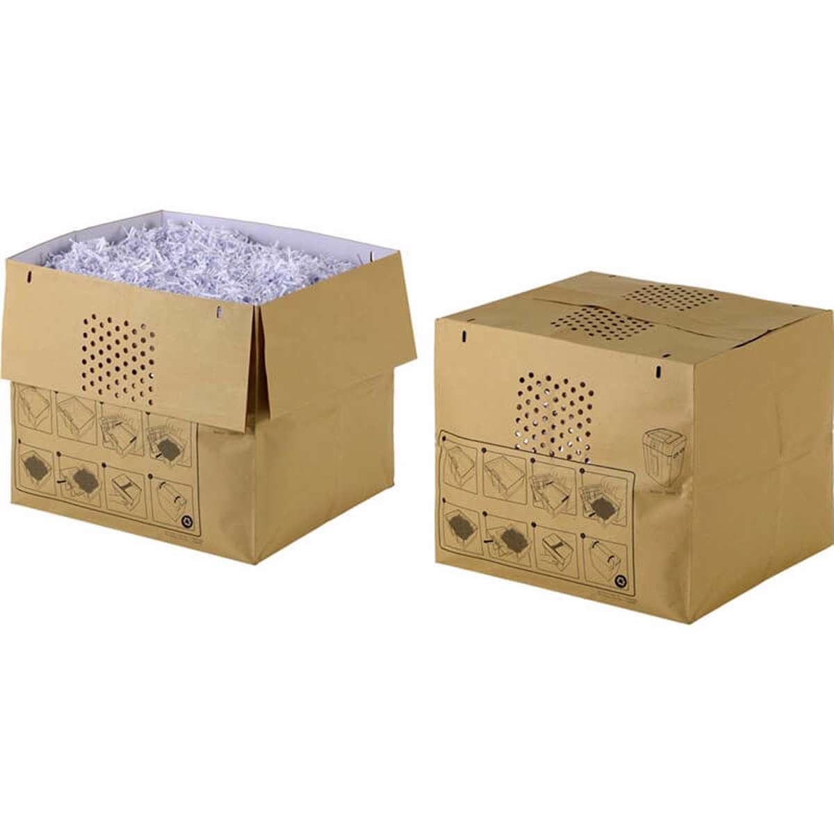 Hjælp med at beskytte miljøet ved at bruge recirkulerbare affaldssække til Auto+ 300X Auto Feed makuleringsmaskiner. Placer sækken i den udtrækbare beholder på makuleringsmaskinen. Fronten har perforering, så det er muligt at se gennem synsvinduet og se, hvormeget makuleret indhold sækken indeholder. Når den er fuld tages sækken fra beholderen, lukkes med de selvklæbende strips og erstattes med en anden. Sækken indeholdende de makulerede papirer kan alt sammen recirkuleres uden at du skal fjerne indholdet.