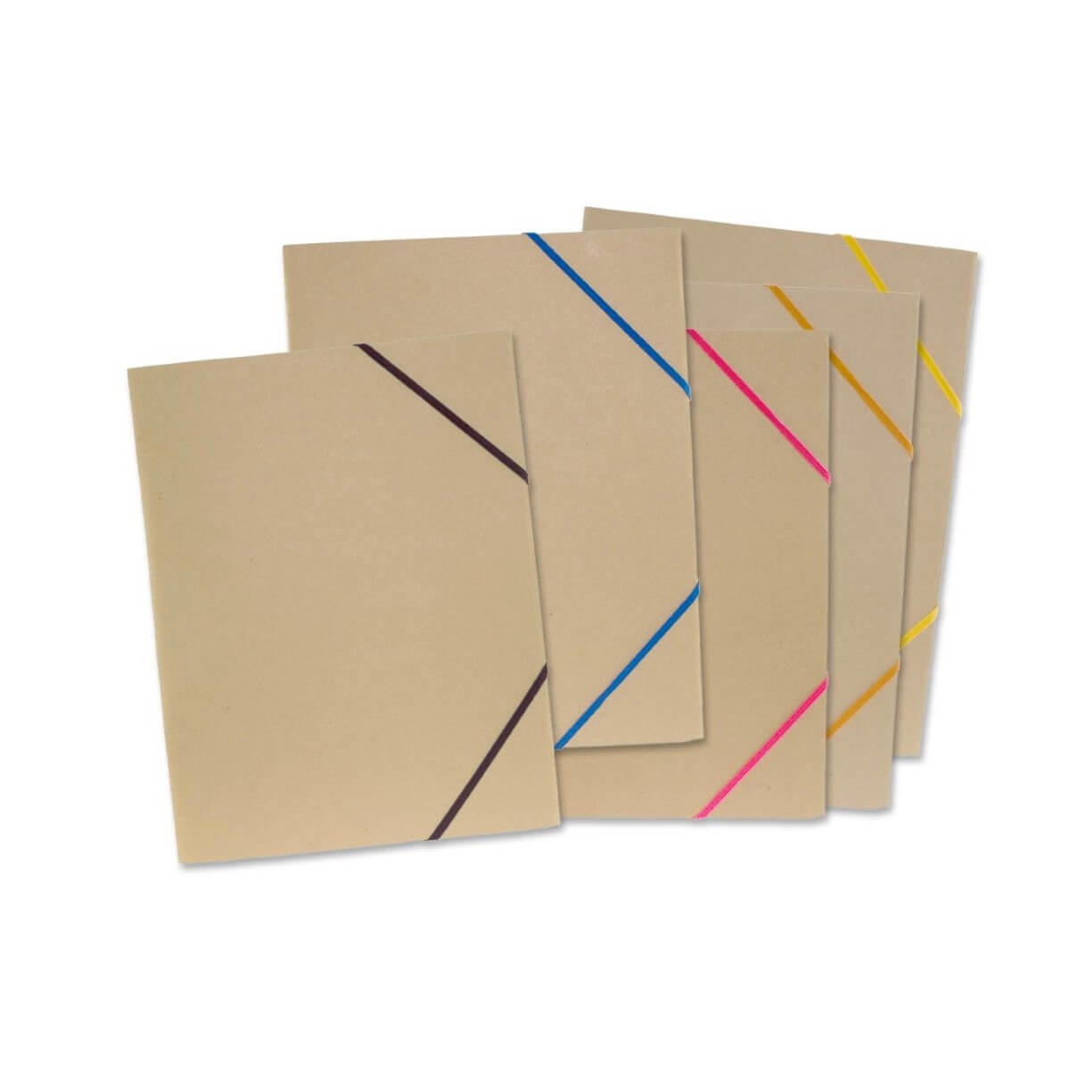 Elastikmappe i A4 format fra B.N.T fremstillet af 100 % naturfarvet 400 g. genbrugspapir med farvet elastikbånd. Mappen har tre indvendige klapper, der holder dine papirer pænt organiserede, og elastiklukningen sikrer, at mappen forbliver lukket, og at dine dokumenter er beskyttet under transport. Mapperne leveres med assorterede elastikfarver i enten sort, lyserød, gul, blå eller orange.