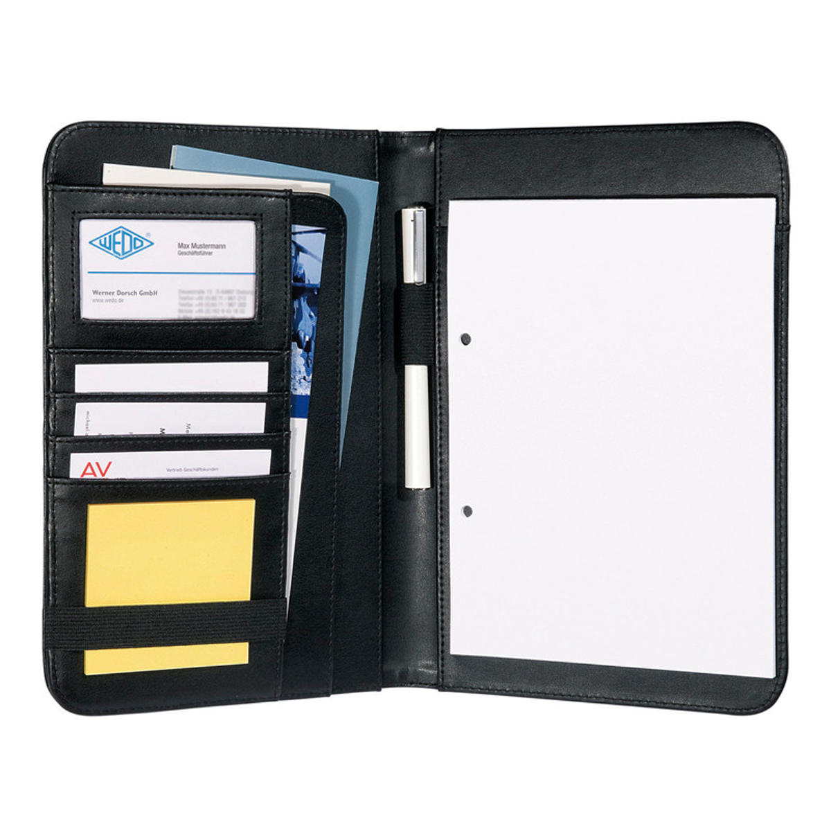 Wedo Konferencemappe eller dokumentmappe i A5 format fremstillet af blødt, sort kunstlædermateriale med plads til alle vigtige dokumenter. Mappen har 2 A5 lommer, en penneholder og 8 lommer til visitkort eller kreditkort. Mappen leveres i en 4-farvet gaveæske.