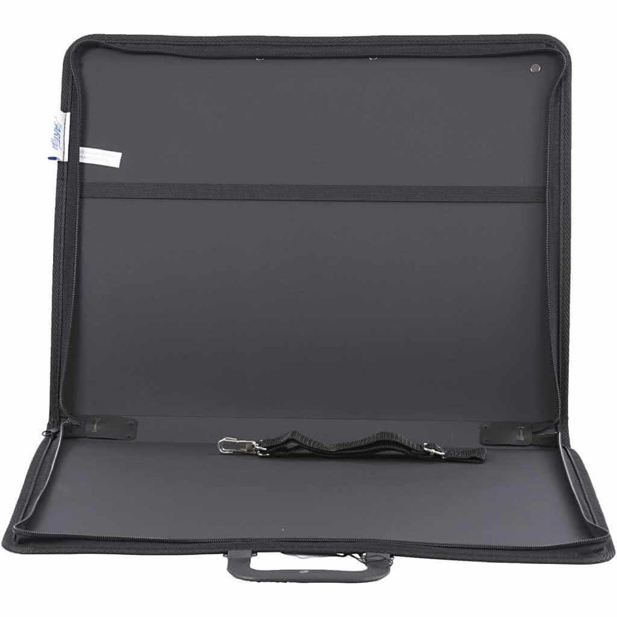 Portfoliomappe af vandafvisende polypropylen med lynlås og håndtag. Den store mappe til A3-dokumenter og -tegninger har tværgående strop indvendig til at holde styr på arkene. Udvendigt har portefoliomappen beslag til montering af den medfølgende regulérbare skulderrem.