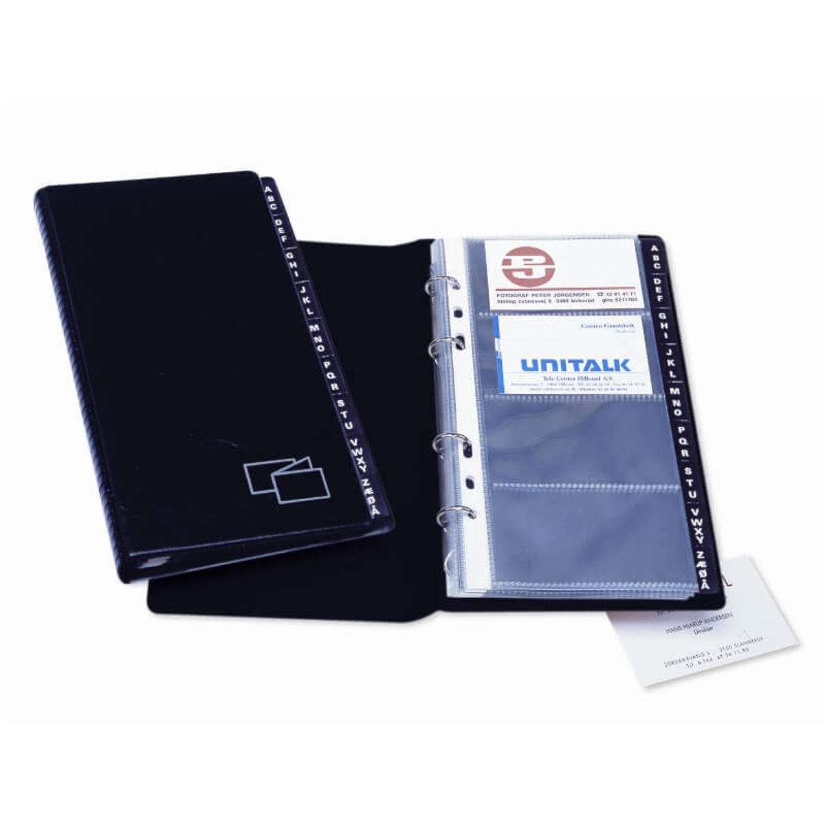 Visitkortmappen fra Bantex er isat 6 stk. visitkortlommer med plads til i alt 48 visitkort i max. størrelse 100 mm x 55 mm samt 6 stk. visitkortlommer med plads til i alt 36 visitkort i max. størrelse 100 mm x 74 mm. Forsiden af albummet er smallere end registeret og dækker ikke for fanerne, når bindet er lukket. Der kan suppleres med ekstra visitkortlommer (4-delt). Ringbindet er fremstillet i genbrugspap betrukket med slidstærk plast.