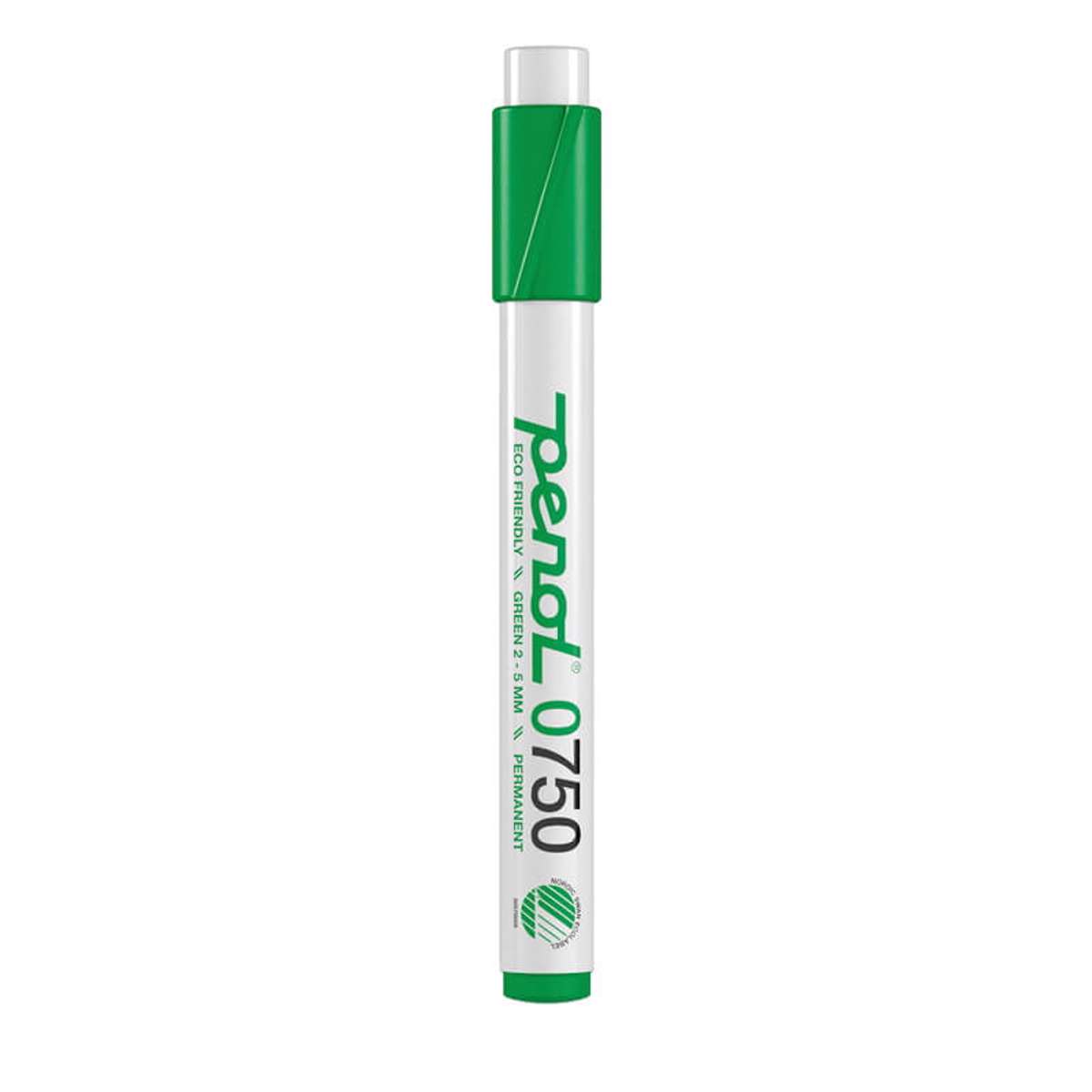 Penol 0750 er den klassiske marker, med robust akrylspids og alkoholbaseret permanent blæk. Den kan derfor skrive på de fleste overflader, som plastik, glas, metal og pap. Nu med PP-hylster, (hætte, krop og endplug) - det miljøvenlige alternativ. Fri for xylen, PVC og nikkel. Hætte i skrivefarven. Den skriver med en stregbredde på 2-5 mm og fås i sort, rød, blå, grøn.
