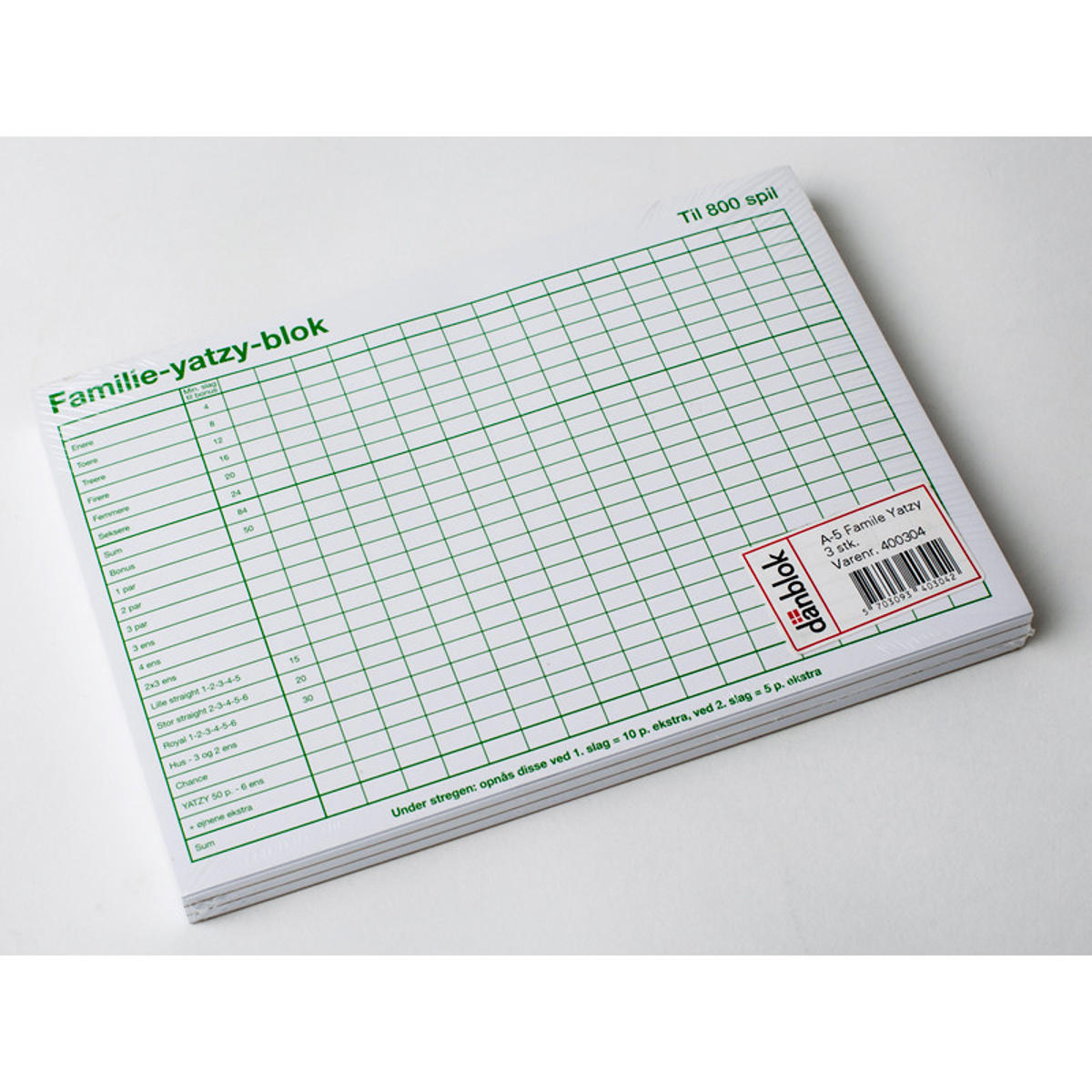 Terningespil for hele familien. Yatzy blok til 6 terninger i A5 størrelse. 3 blokke pr. pakke med 800 ark.