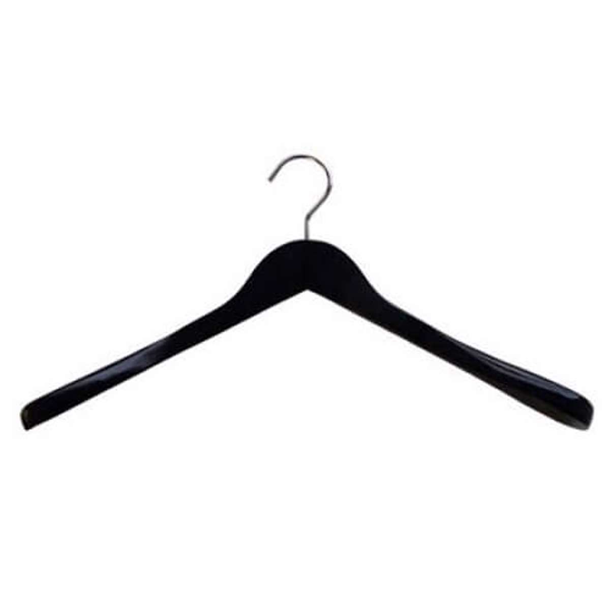 Denne flotte træbøjle i sort højglans er med sin længde og facon ideel til elegant fremvisning af jakker og overtøj.