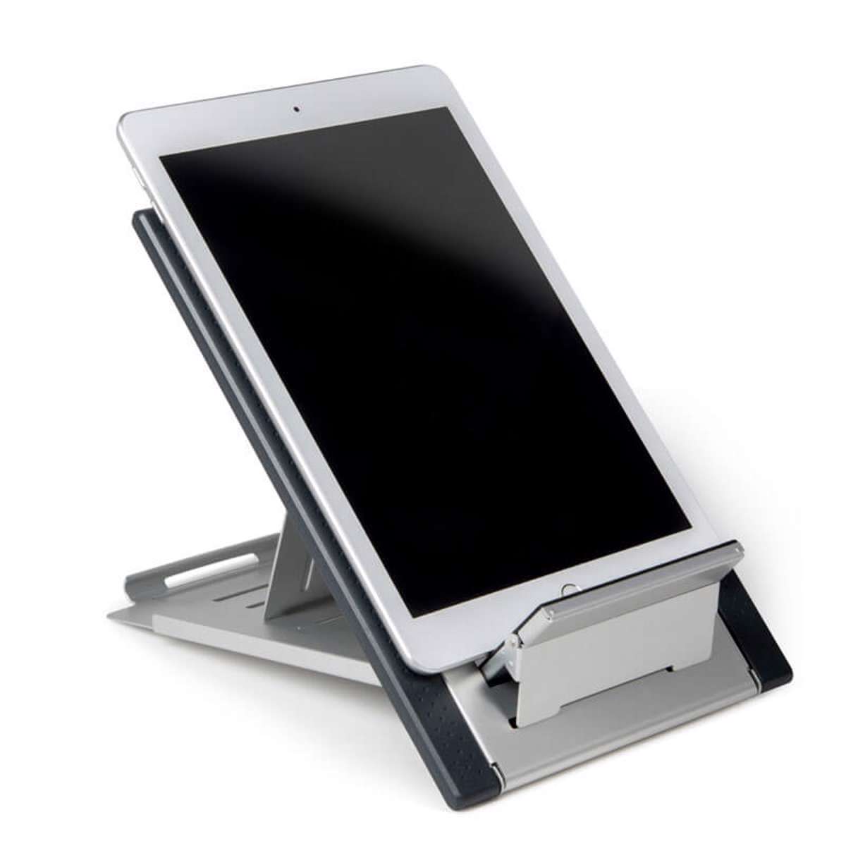 Laptop/Tablet Stand har 6 niveauer for højdejustering af synsfeltet. Dens evne til tilpasning fører til forbedret varmefordeling og bidrager samtidig til et kompakt og transportabelt design.