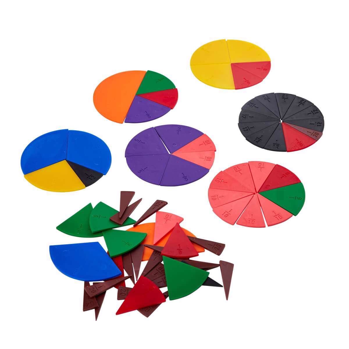 Smarte brøkcirkler i kraftig plastik. Sættet består af 10 brøkcirkler i hver sin farve med markering og måler 10 cm i diameter.