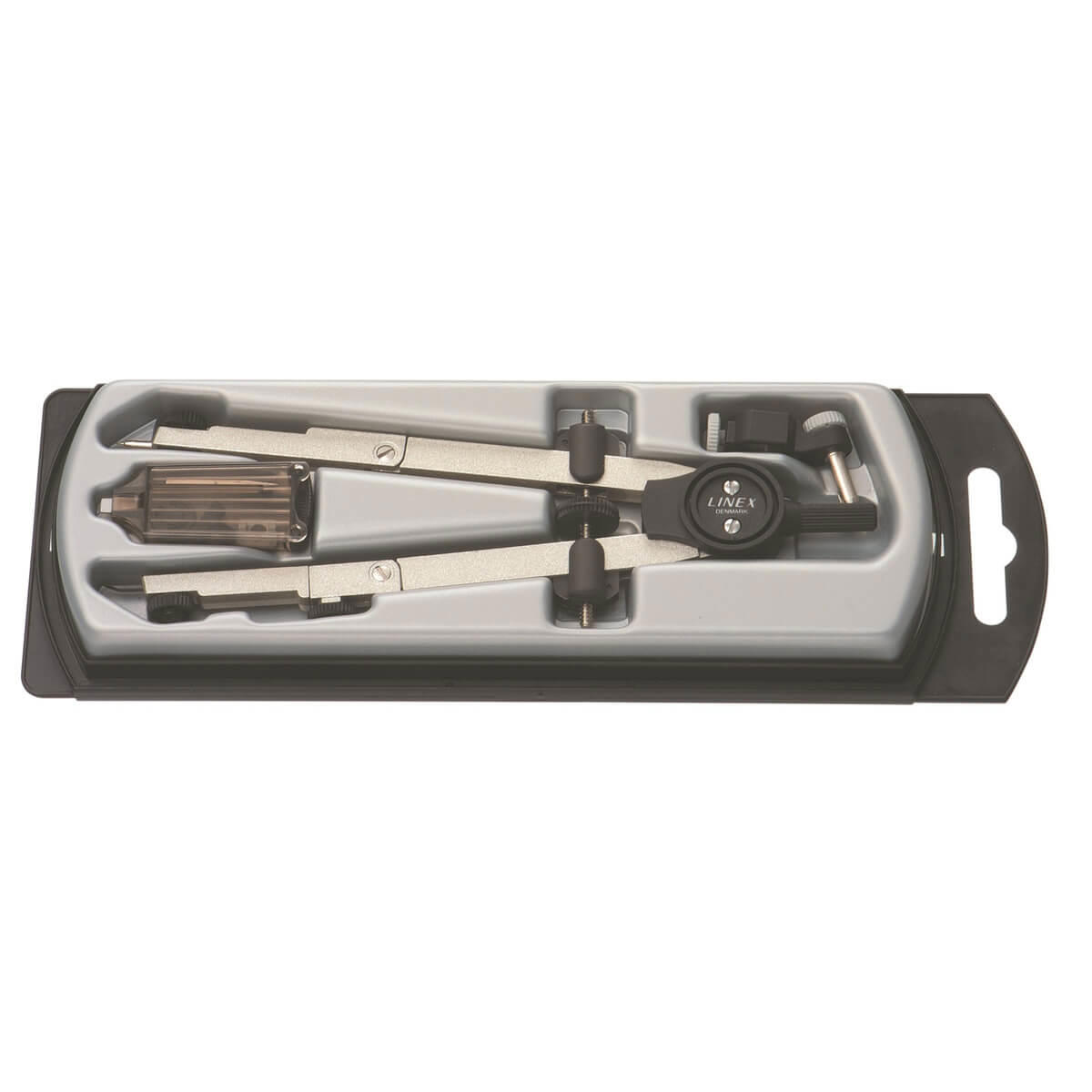 Jomfrupasser med knæk på begge ben. Cirkler op til 340 mm Ø. Tuschindsats samt etui med ekstra bly og reservedele medfølger.