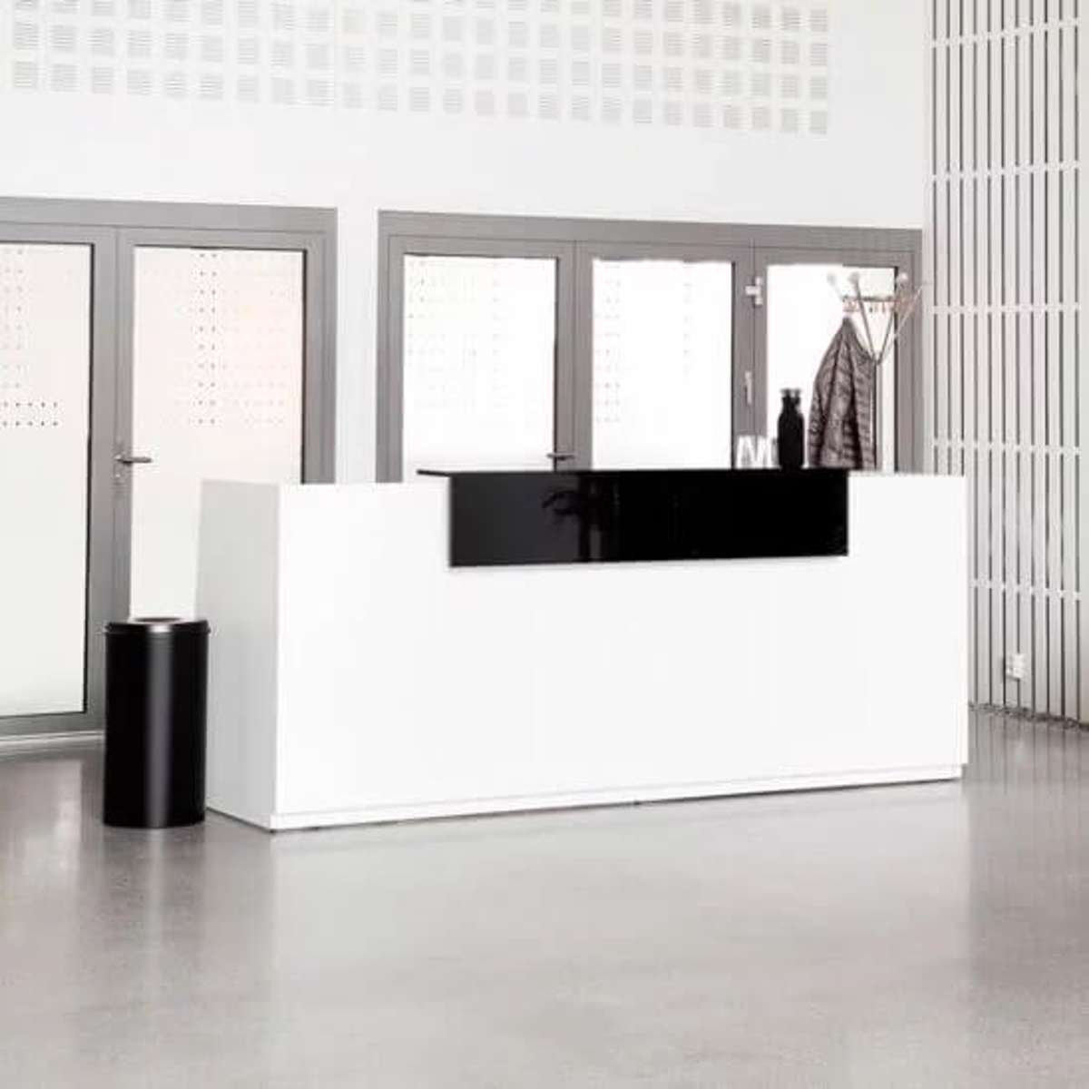 Libra receptionsskranke leveres komplet med sokkel i hvid laminat og en sort højglanspoleret laminatplade som top. Dimension er h x b x d = 1100 x 2600 x 770 mm. Receptionsskranke Libra er en flot & klassisk skranke som passer godt ind i de fleste lokaler. Arbejdsbredde på 2500 mm og dybde på 650 samt 3 kabelgennemføringer giver dig mulighed for en god og ryddelig arbejdsstation.
