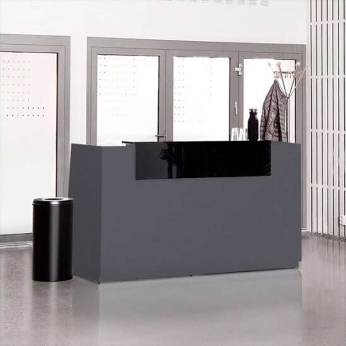 Libra receptionsskranke - hæve/sænkebord leveres komplet i antracitgrå laminat og en sort højglanspoleret laminatplade som top. Dimension er h x b x d = 1225 x 1730 x 870 mm. Receptionsskranke Libra er en flot & klassisk skranke som passer godt ind i de fleste lokaler. Skranken har en justerbar højde på 700-1170 mm. Arbejdsbredde på 1630 mm og dybde på 730 samt 3 kabelgennemføringer giver dig mulighed for en god og ryddelig arbejdsstation.