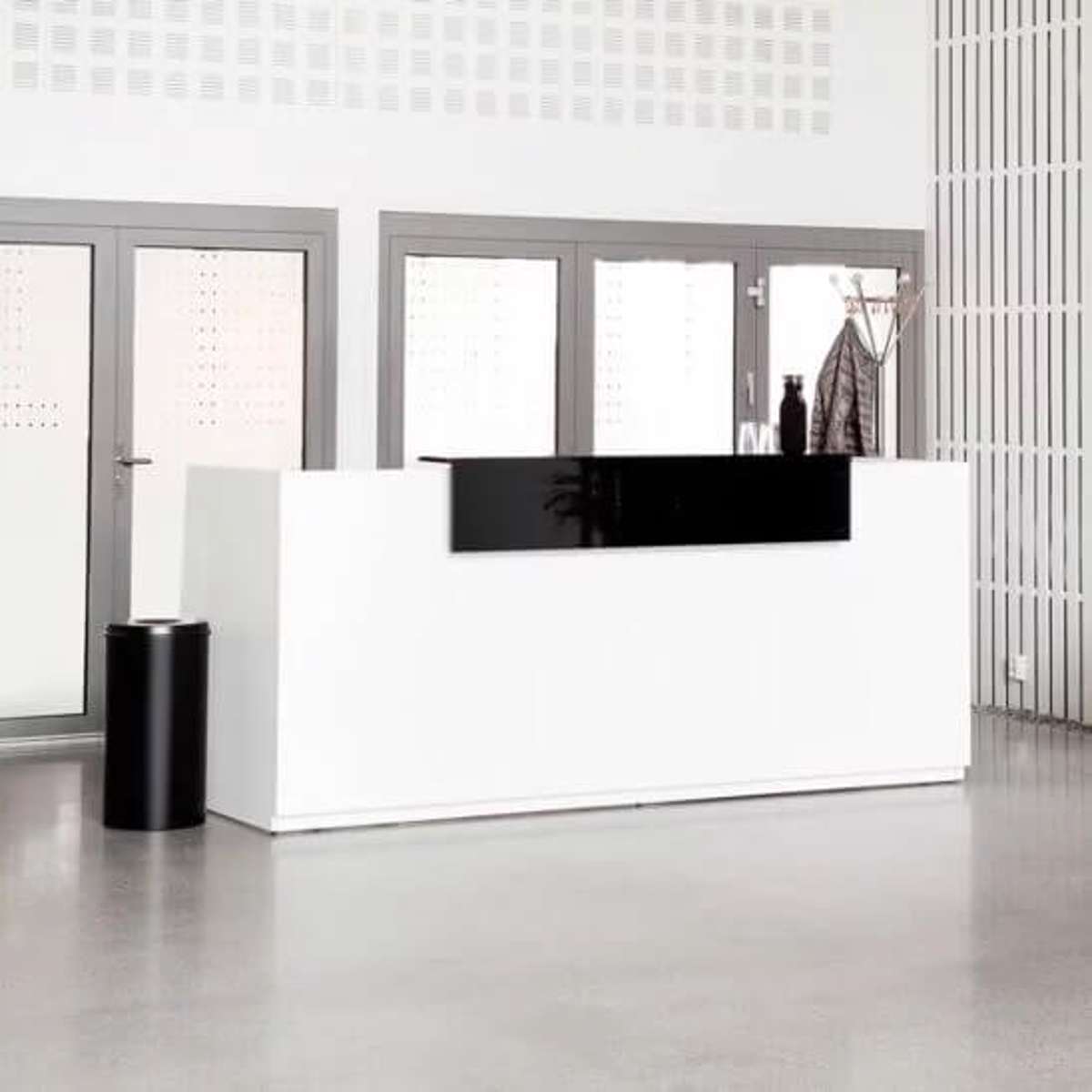 Libra receptionsskranke - hæve/sænkebord leveres komplet med sokkel i hvid laminat og en sort højglanspoleret laminatplade som top. Dimension er h x b x d = 1225 x 2600 x 870 mm. Receptionsskranke Libra er en flot & klassisk skranke som passer godt ind i de fleste lokaler. Skranken har en justerbar højde på 700-1170 mm. Arbejdsbredde på 2500 mm og dybde på 730 samt 3 kabelgennemføringer giver dig mulighed for en god og ryddelig arbejdsstation.