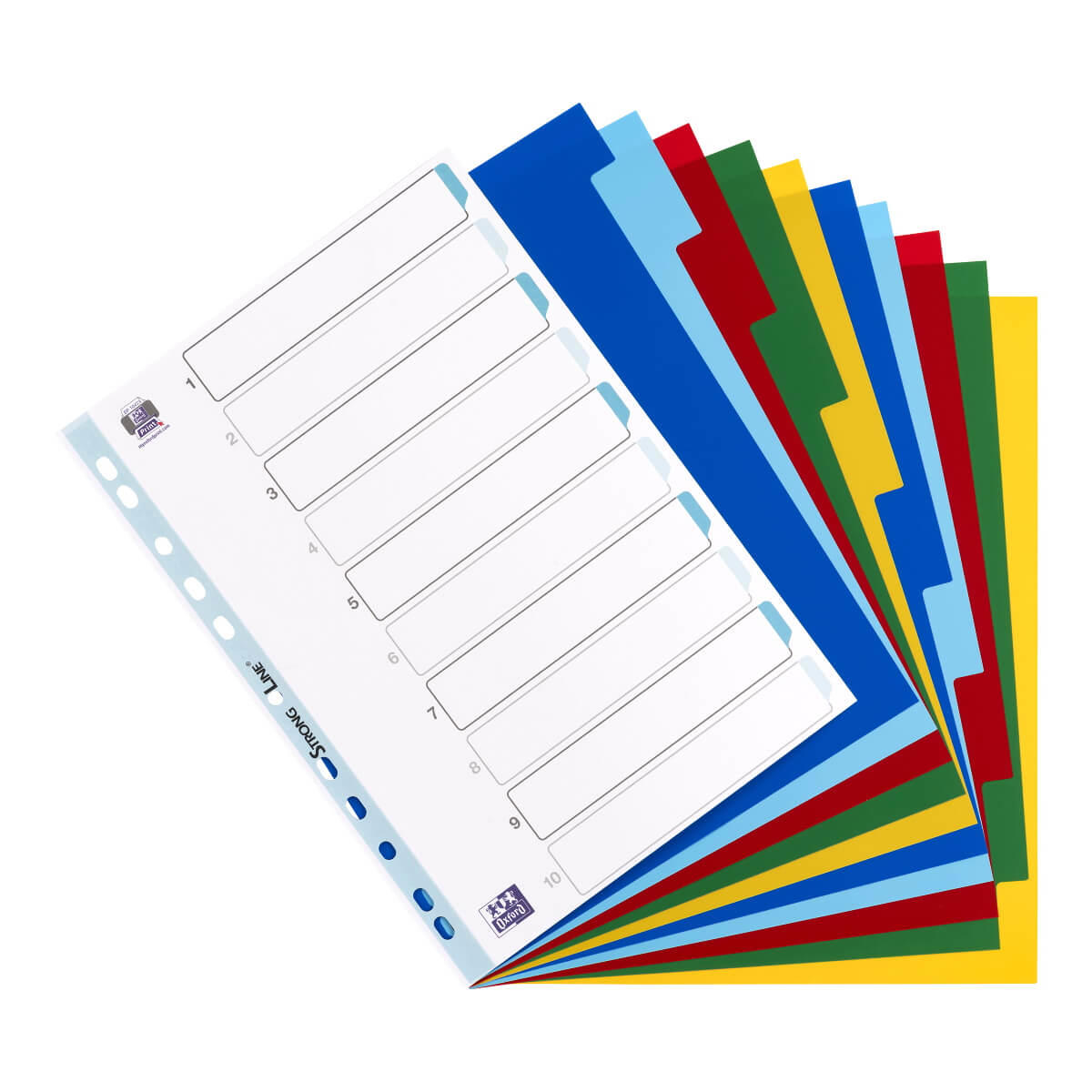 10-delt faneblad fra Oxford Bantex i stærke farver og blåt pil-design til A4 Maxi-format. Det ekstra brede faneblad gør det nemt at se fanerne, selvom dokumenterne er i plastlommer. Forsiden er fremstillet af karton og med 10 store tekstfelter til at skrive indhold på, så du hurtigt kan finde det, du leder efter. Fanerne er fremstillet i kraftig PP-folie, og har 11 forstærkede ekstra holdbare universalhuller, der passer til de fleste A4-mapper.