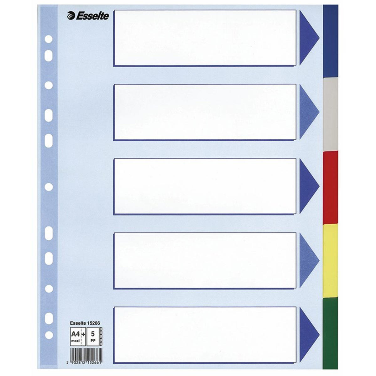 Esseltes 5-delte faneblade i A4 Maxi format med friske farvekombinationer for nem visuel sortering af dine dokumenter. De ekstra brede faner gør det nemt at se fanerne, selvom dokumenterne er i plastlommer. Fanebladets forside har store felter til beskrivende tekst, så du hurtigt kan finde det, du leder efter. Den plastforstærkede hulkant på forsiden øger slidstyrken og forhindrer, at forsiden rives ud, og de 11 universalhuller passer til de fleste ringbind og brevordnere. Fanebladets forside er fremstillet af 130 g karton, og fanerne af 0,12 mm PP-folie.