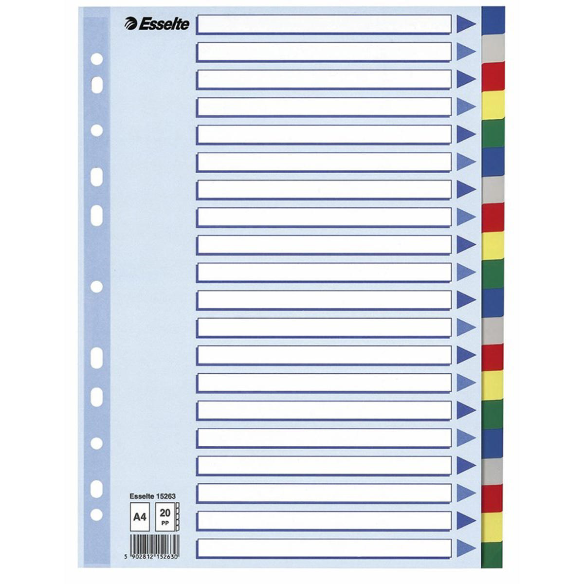 Esseltes 20-delte faneblade i A4 format med friske farvekombinationer for nem visuel sortering af dine dokumenter. Fanebladets forside har store felter til beskrivende tekst, så du hurtigt kan finde det, du leder efter. Den plastforstærkede hulkant på forsiden øger slidstyrken og forhindrer, at forsiden rives ud, og de 11 universalhuller passer til de fleste ringbind og brevordnere. Fanebladets forside er fremstillet af 130 g karton, og fanerne af 0,12 mm PP-folie.