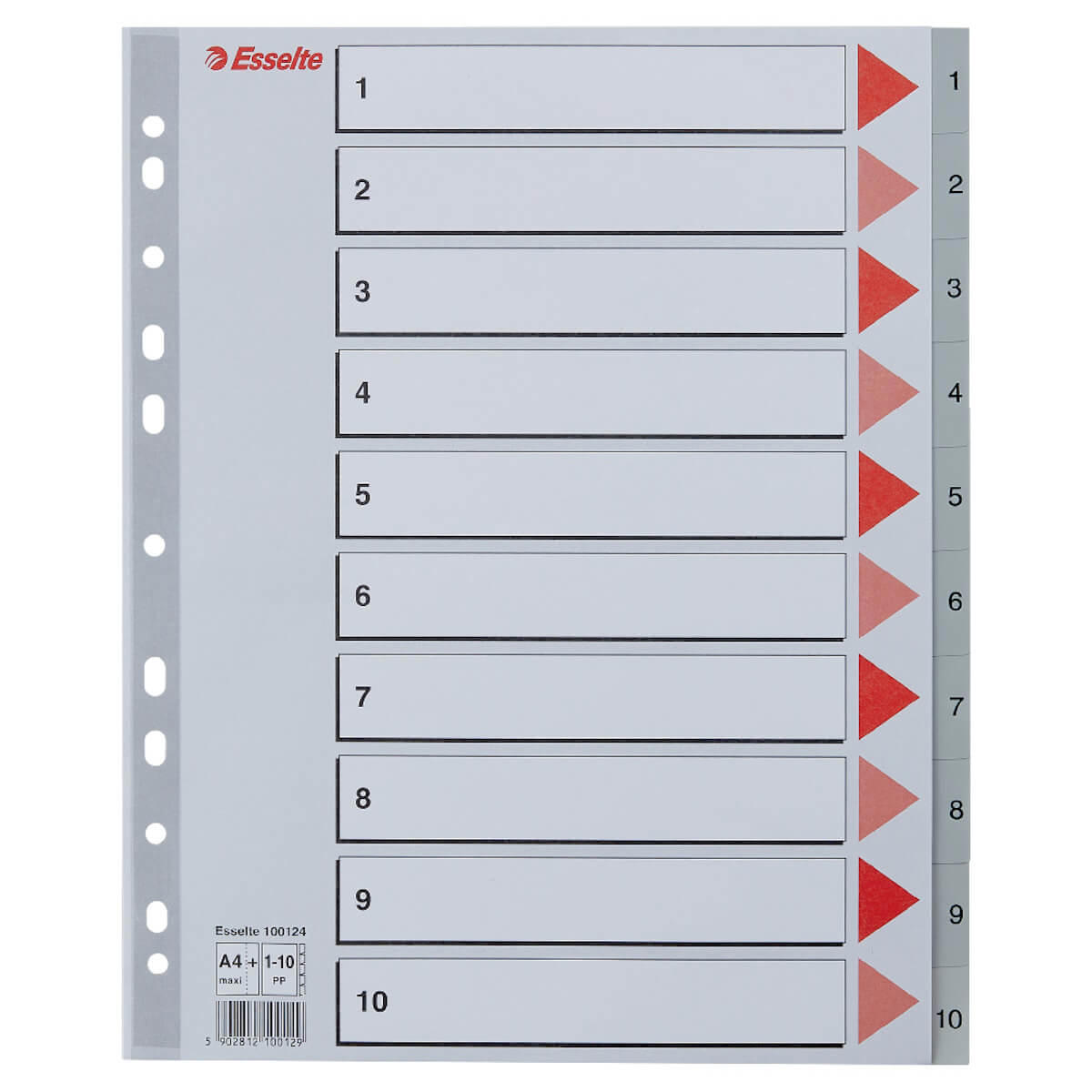 Ekstra bredt register fra Esselte i grå farver med rødt pil-design i A4 Maxi-format, der gør at fanebladene ikke dækkes af plastlommerne. Registret er fremstillet i kraftig PP folie med faneblade fra 1-10 og et kartonforblad med 10 store tekstfelter til at skrive indhold på, så du hurtigt kan finde det, du leder efter. De 11 forstærkede ekstra holdbare universalhuller passer til de fleste brevordnere og ringbind, og den plastforstærkede hulkant på forbladet øger slidstyrken og forhindrer, at forsiden rives ud.