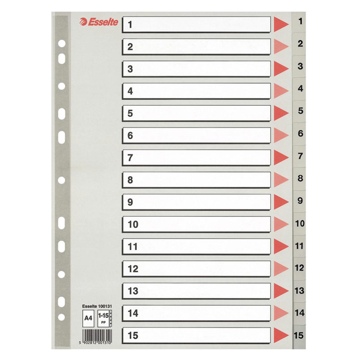 Dette robuste register fra Esselte i grå farver med rødt pil-design i A4 format er en praktisk og effektiv måde at organisere dine papirer på. Registret er fremstillet i kraftig PP folie med faneblade fra 1-15 og et kartonforblad med 15 store tekstfelter til at skrive indhold på, så du hurtigt kan finde det, du leder efter. De 11 forstærkede ekstra holdbare universalhuller passer til de fleste brevordnere og ringbind, og den plastforstærkede hulkant på forbladet øger slidstyrken og forhindrer, at forsiden rives ud.