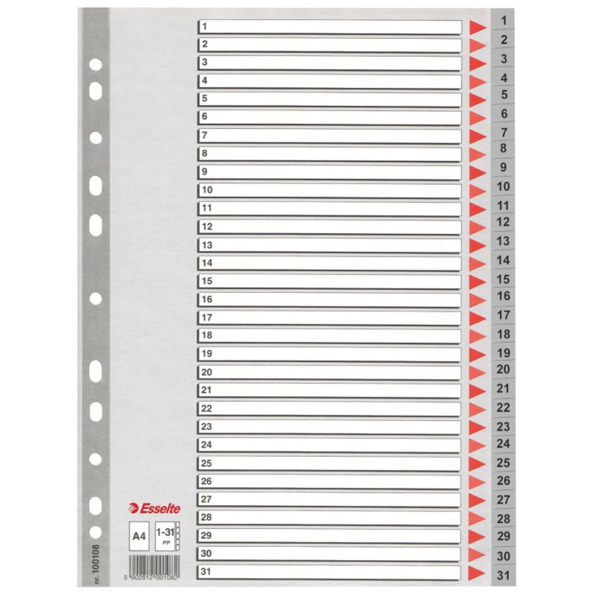 Dette hårdføre register fra Esselte i grå farver med rødt pil-design i A4 format er en praktisk og effektiv måde at organisere dine papirer på. Registret er fremstillet i kraftig PP folie med faneblade fra 1-31, svarende til dagene i en måned, og et kartonforblad med 31 mindre tekstfelter til at skrive indhold på, så du hurtigt kan finde det, du leder efter. De 11 forstærkede ekstra holdbare universalhuller passer til de fleste brevordnere og ringbind, og den plastforstærkede hulkant på forbladet øger slidstyrken og forhindrer, at forsiden rives ud.