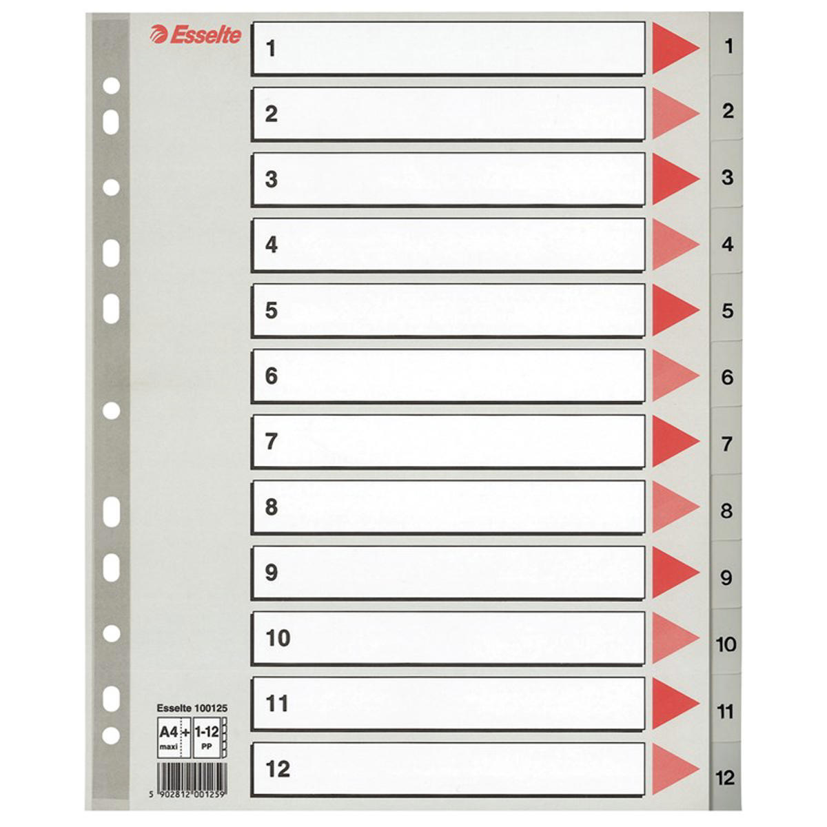 Ekstra bredt register fra Esselte i grå farver med rødt pil-design i A4 Maxi-format, der gør at fanebladene ikke dækkes af plastlommerne. Registret er fremstillet i kraftig PP folie med faneblade fra 1-12 og et kartonforblad med store 12 tekstfelter til at skrive indhold på, så du hurtigt kan finde det, du leder efter. De 11 forstærkede ekstra holdbare universalhuller passer til de fleste brevordnere og ringbind, og den plastforstærkede hulkant på forbladet øger slidstyrken og forhindrer, at forsiden rives ud.