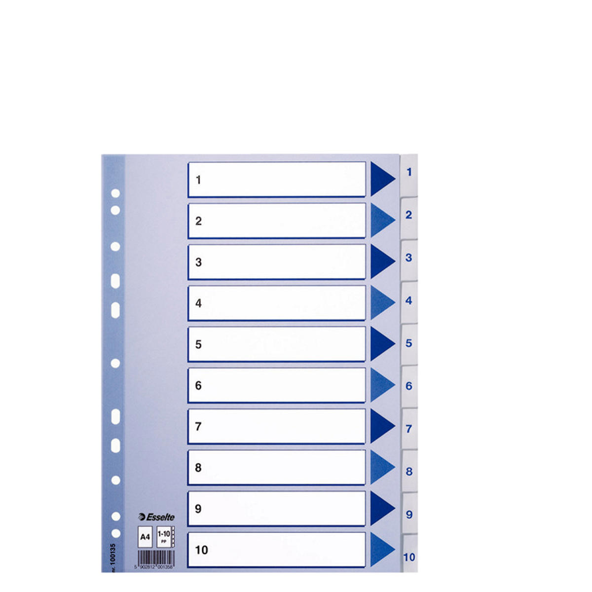 Dette robuste register fra Esselte i blå-hvide farver med blåt pil-design i A4 format er en praktisk og effektiv måde at organisere dine papirer på. Registret er fremstillet i kraftig PP folie med faneblade fra 1-10 og et kartonforblad med 10 store tekstfelter til at skrive indhold på, så du hurtigt kan finde det, du leder efter. De 11 forstærkede ekstra holdbare universalhuller passer til de fleste brevordnere og ringbind, og den plastforstærkede hulkant på forbladet øger slidstyrken og forhindrer, at forsiden rives ud.