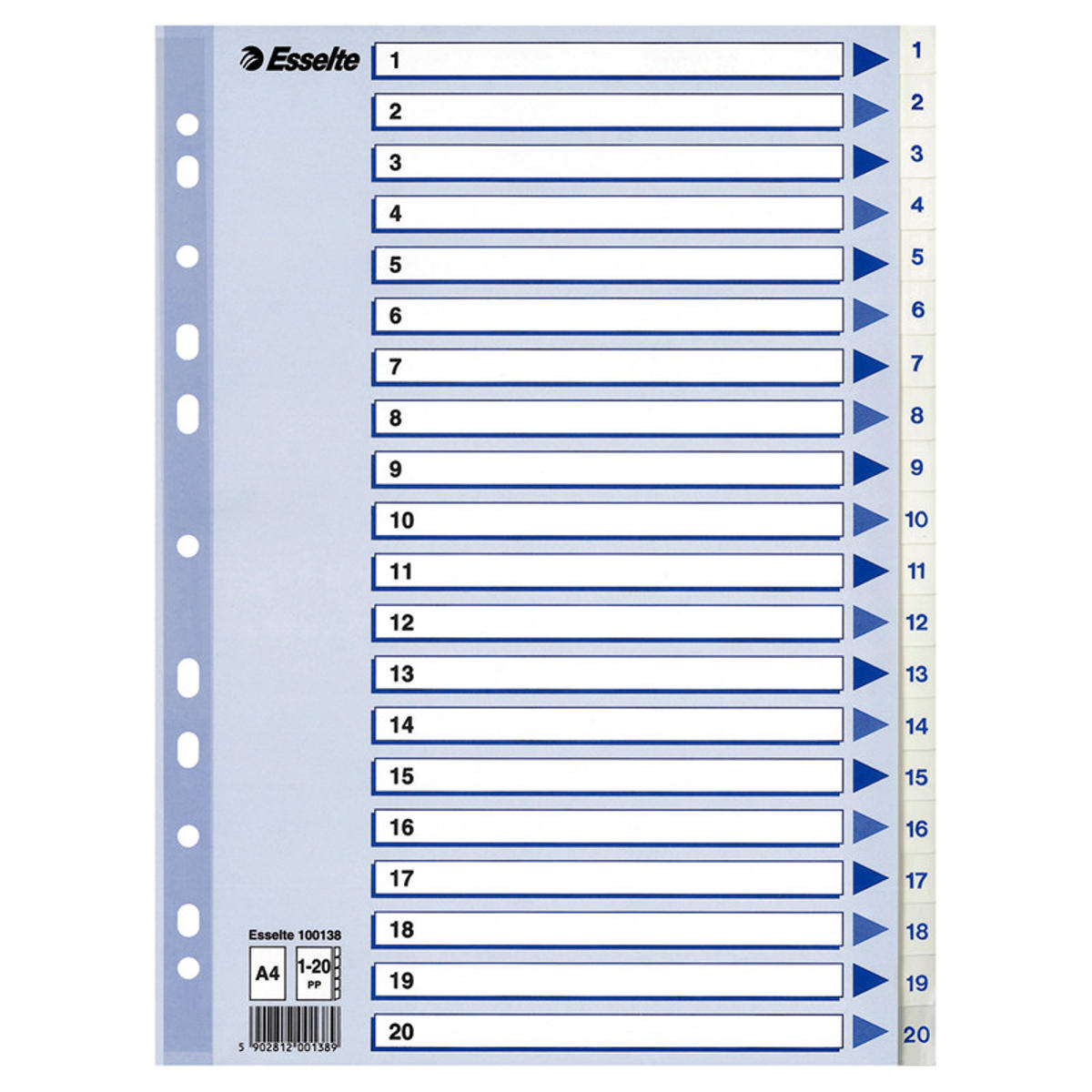 Dette robuste register fra Esselte i blå-hvide farver med blåt pil-design i A4 format er en praktisk og effektiv måde at organisere dine papirer på. Registret er fremstillet i kraftig PP folie med faneblade fra 1-20 og et kartonforblad med 20 mindre tekstfelter til at skrive indhold på, så du hurtigt kan finde det, du leder efter. De 11 forstærkede ekstra holdbare universalhuller passer til de fleste brevordnere og ringbind, og den plastforstærkede hulkant på forbladet øger slidstyrken og forhindrer, at forsiden rives ud.