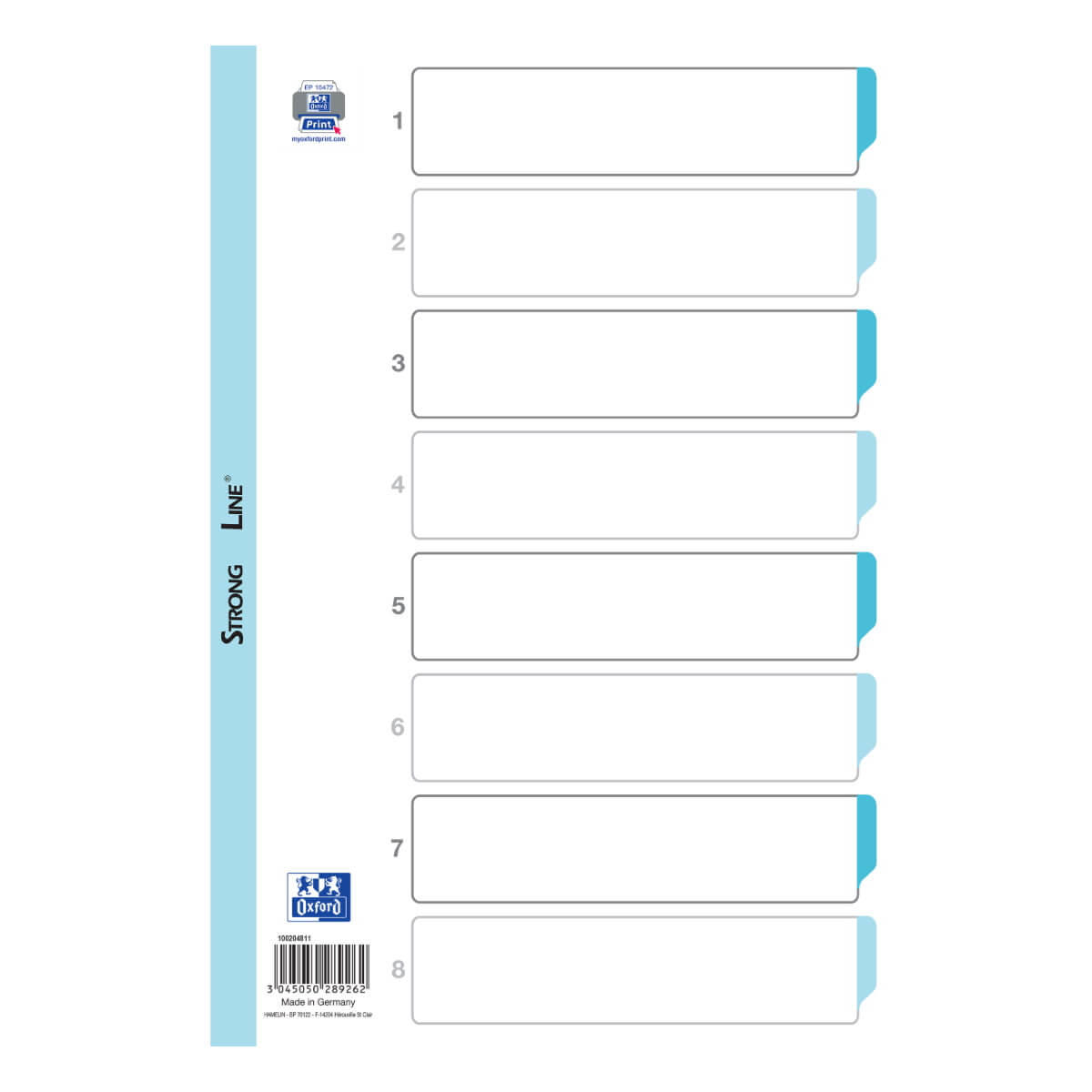 Dette A4-register fra Oxford er en praktisk og effektiv måde at organisere dine papirer på. Med sin klare inddeling, slidstærke materiale og professionelle design er det et must-have for alle, der ønsker at have styr på deres papirarbejde. Registrets kartonforblad er udstyret med skrivefelter med fanemarkering og Strong-Line hulforstærkning der sikrer, at det holder i længden. Fanebladene er numerisk inddelt fra 1-8, hvilket gør det nemt at finde præcis det dokument, du søger. Registrets faneblade er fremstillet af PP-folie, og derfor både fleksibelt og modstandsdygtigt over for hverdagens slid. Personliggør forbladet på www.oxfordprint.com