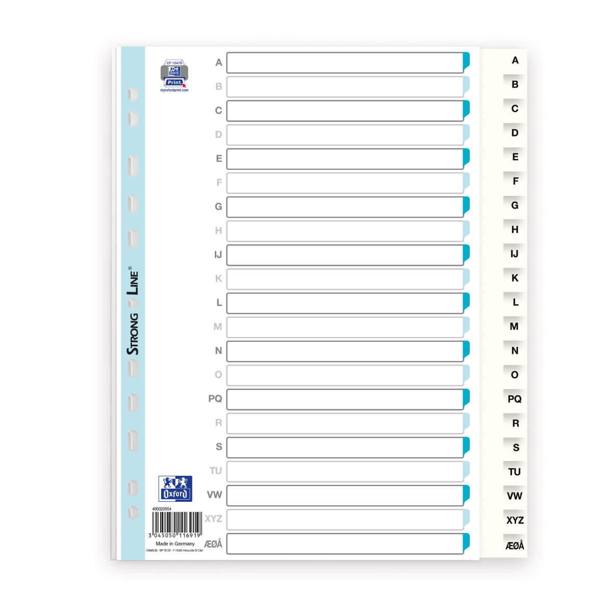 Dette register i A4 Maxi-format fra Oxford er en praktisk og effektiv måde at organisere dine papirer på, og Maxi-formatet sikrer at fanebladene ikke dækkes af plastlommerne. Med sin klare inddeling, slidstærke materiale og professionelle design er det et must-have for alle, der ønsker at have styr på deres papirarbejde. Registrets kartonforblad er udstyret med skrivefelter med fanemarkering og Strong-Line hulforstærkning der sikrer, at det holder i længden. Det er alfabetisk inddelt fra A-Å fordelt på 21 skilleblade, hvilket gør det nemt at finde præcis det dokument, du søger. Registrets faneblade er fremstillet af PP-folie, og derfor både fleksibelt og modstandsdygtigt over for hverdagens slid.