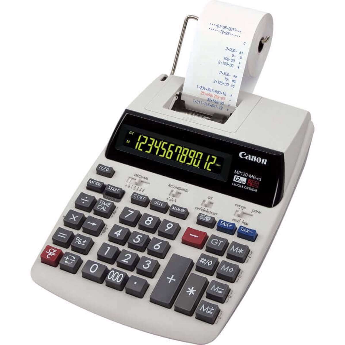 Canon lommeregner / regnemaskine med strimmel MP120-MG-es med 12 cifre og 2-farvet display. En strimmelregner, også kaldet bordregner eller mapperegner, med forretnings,- moms- og valutaomregningsfunktioner der gør den mere effektiv.