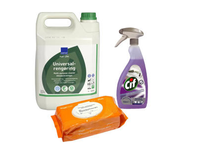 Vores udvalg indenfor rengøringsartikler omfatter bl.a. affaldsspande, -sække og -stativer, aftørringspapir, dispensere, creme, sæbe og desinficerings- og overfladerengøringsmidler, afkalkning og opvask og meget mere. Til kontorer, kantiner, køkkener, badeværelse eller produktionslokaler. Sammensæt dit rengøringssortiment efter dine behov. Mange miljøvenlige varer, som er skånsomme for både dig og miljøet.
